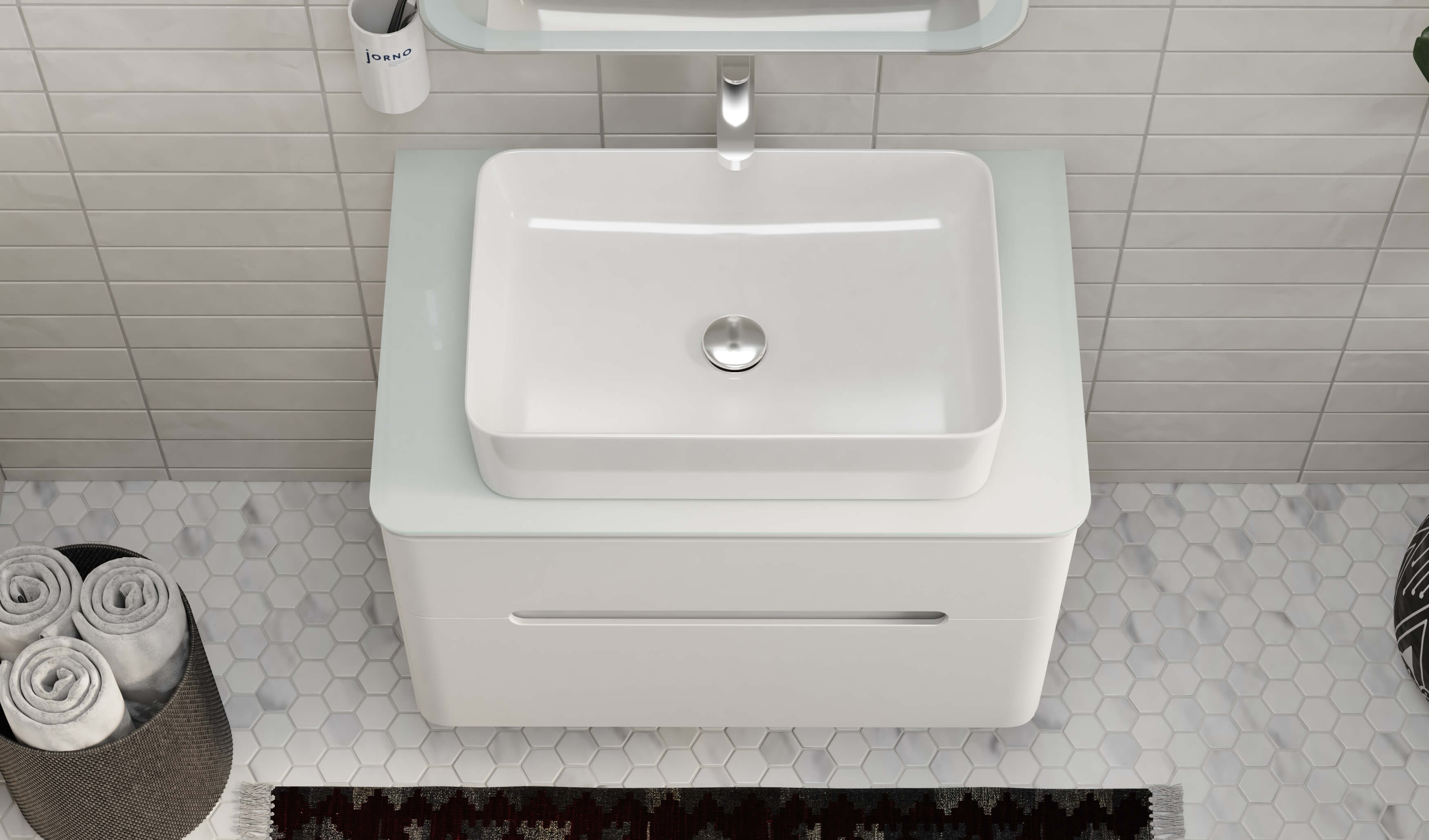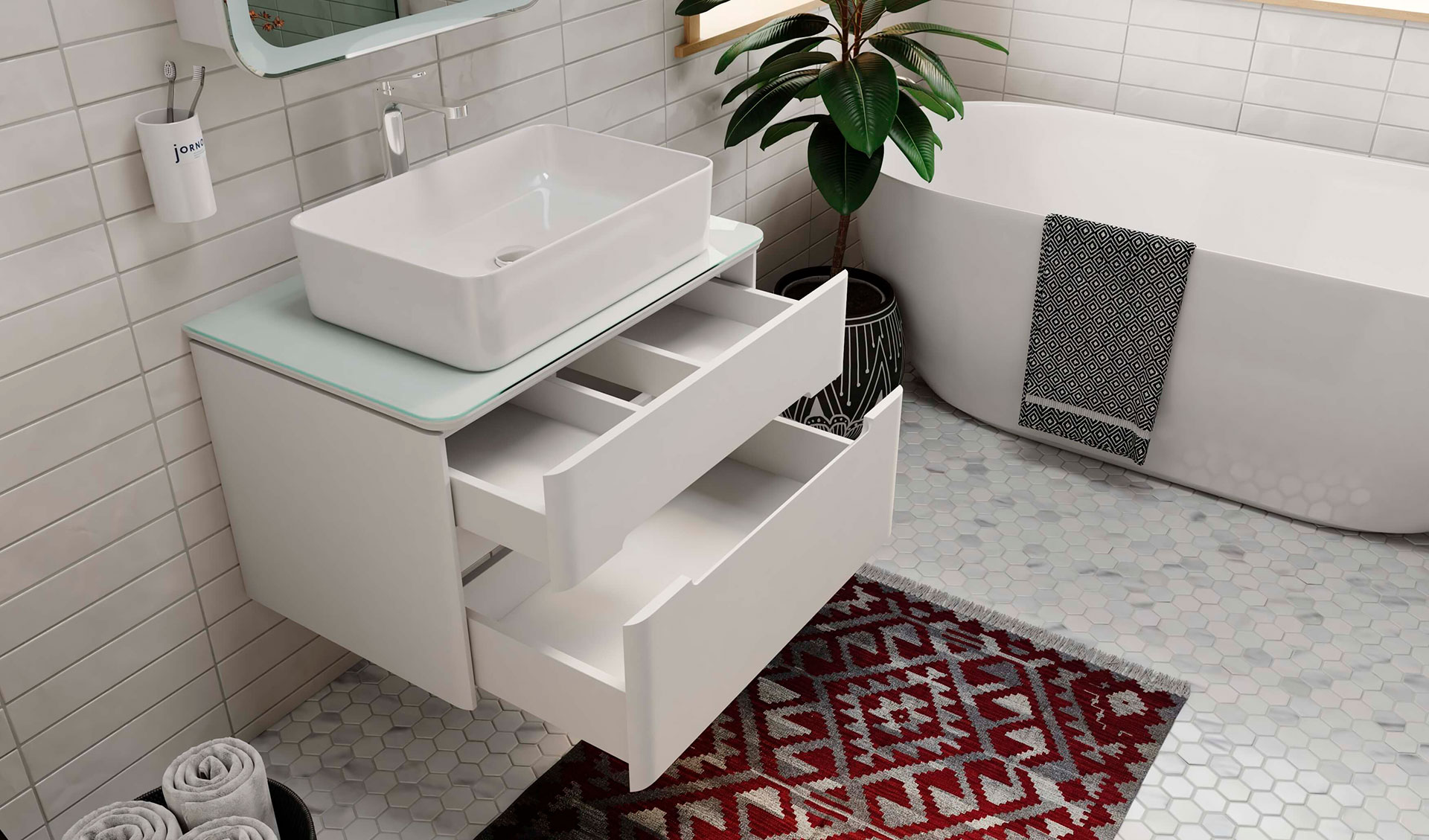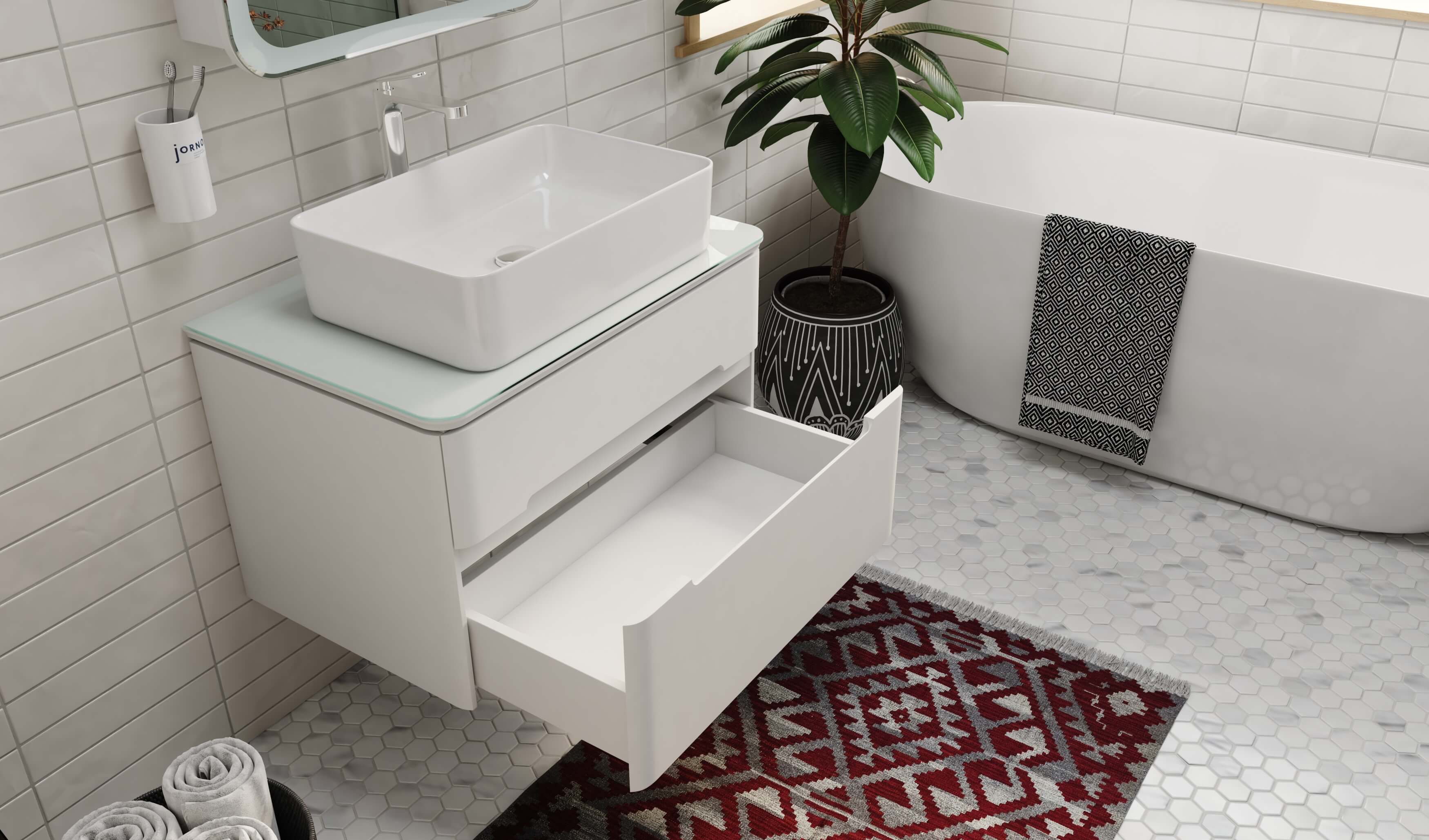 Мягкие линии полукругов на ручках, столешнице, тумбе и зеркале создают позитивный образ, приятный для частого непосредственного контакта.