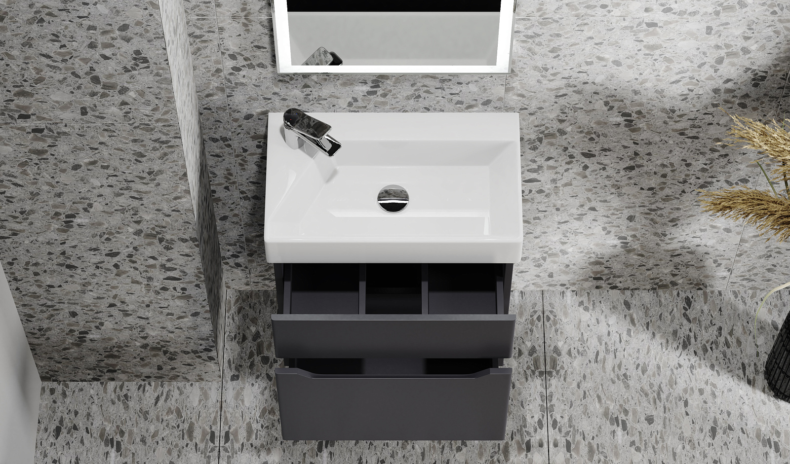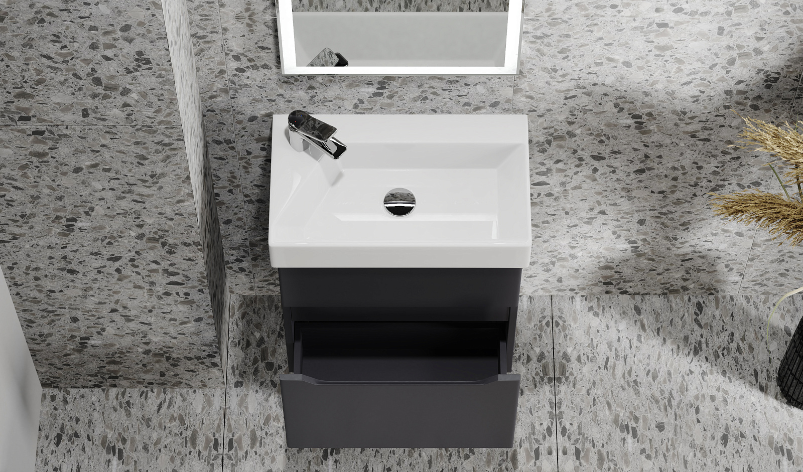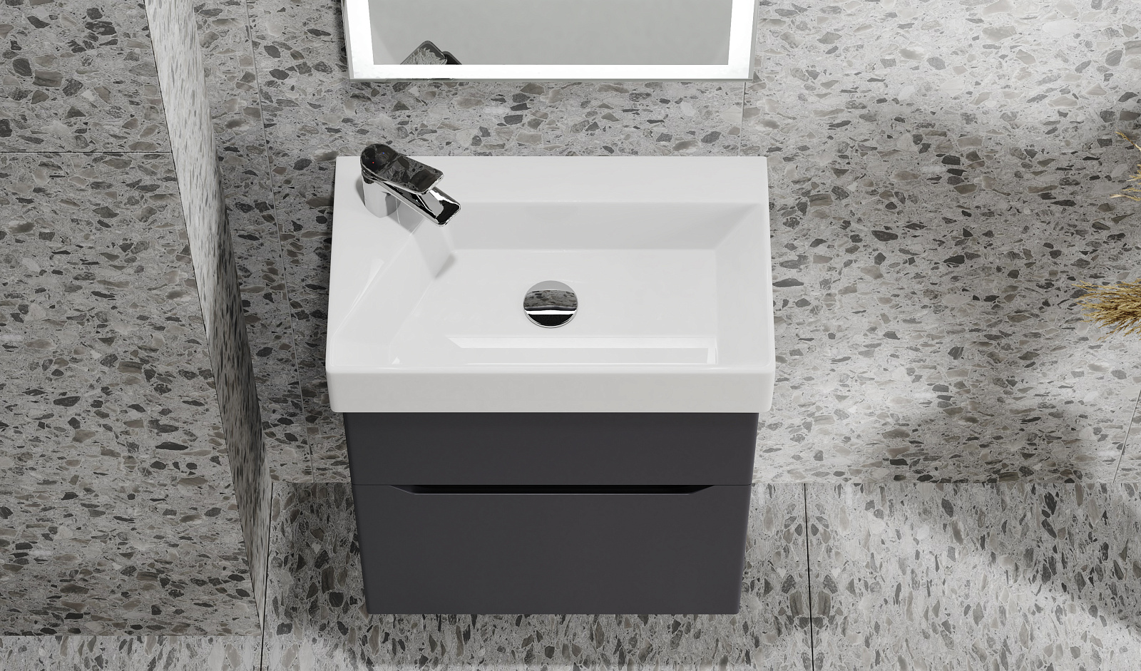 Коллекция Folk разработана для самых компактных ванных комнат. Эргономичная тумба с двумя вместительными ящиками имеет глубину 33 см. Авторский дизайн раковины со смесителем на углу обеспечивает удобство в использовании и экономит пространство. Зеркало оснащено фронтальной подсветкой по периметру, что является дополнительным источником света в ванной комнате и является функциональным решением при проведении косметических и гигиенических процедур.
