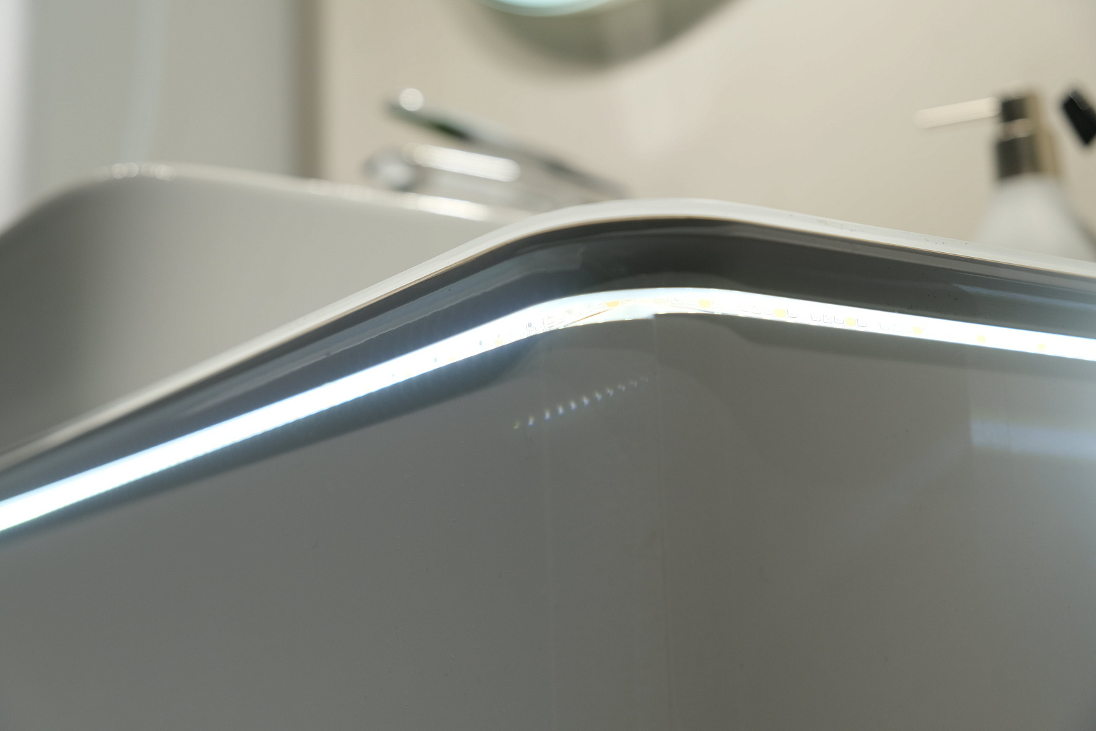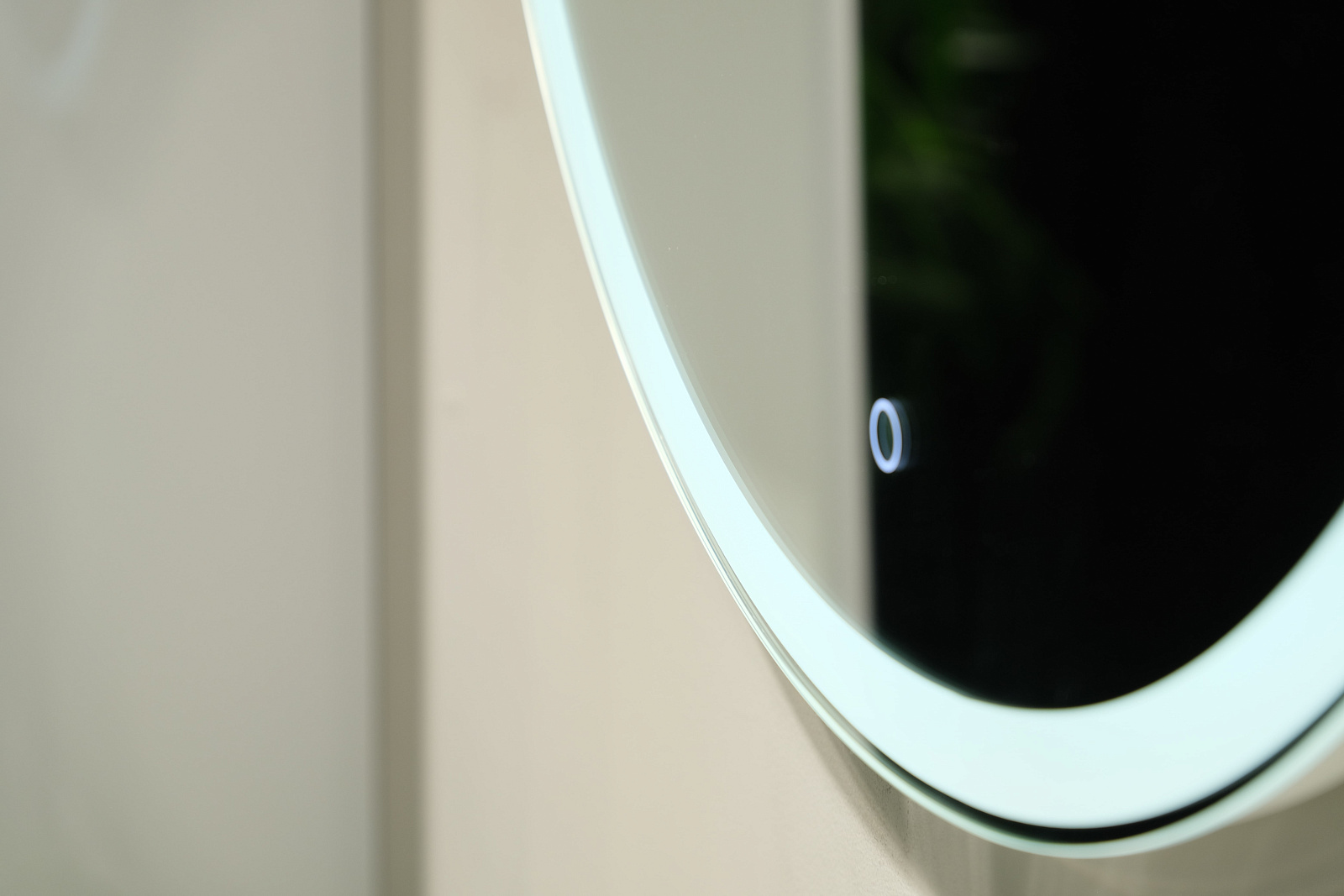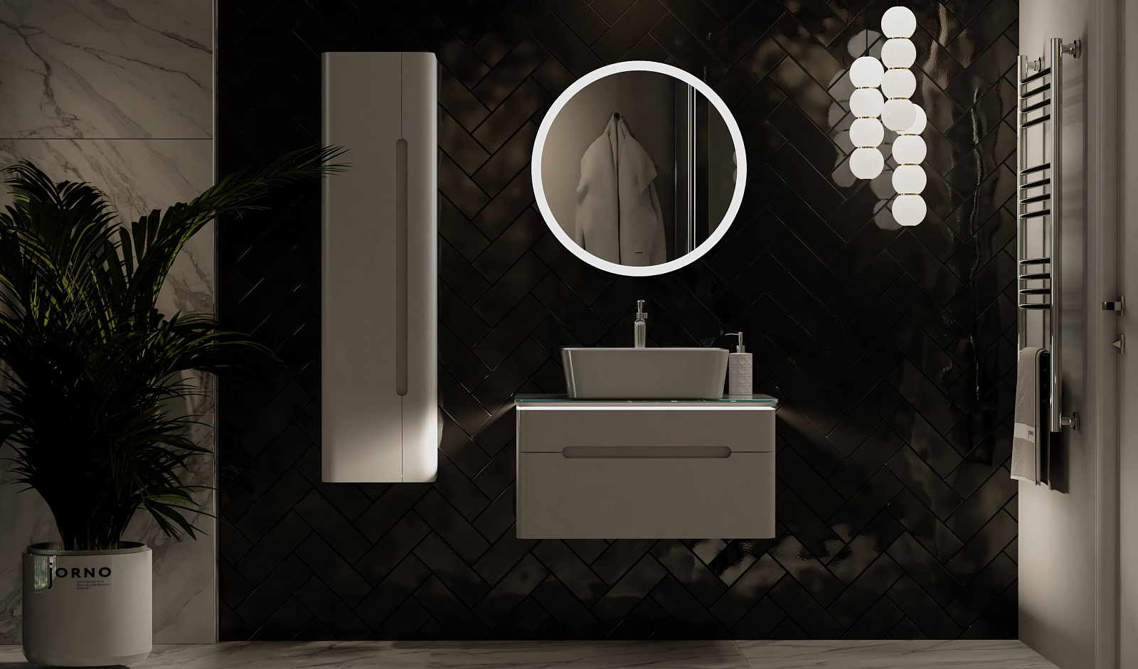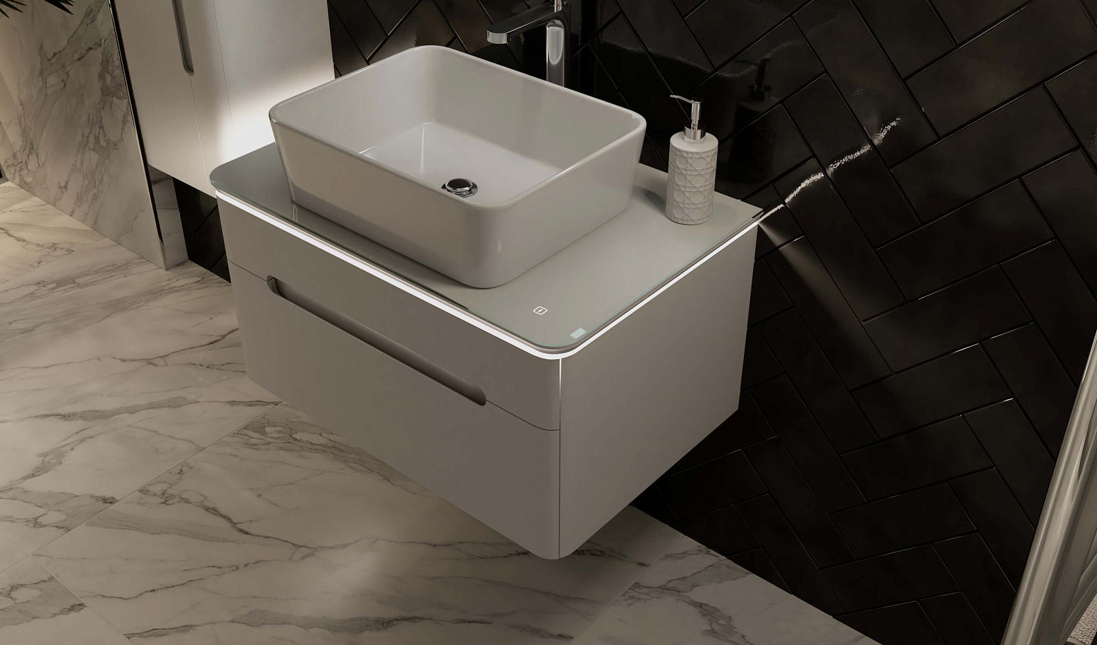 Нижний свет тумбы создает ощущение плавности в пространстве интерьера. Зеркало со светодиодной подсветкой в сочетании со столешницей из стекла Lacobel придает легкость композиции.