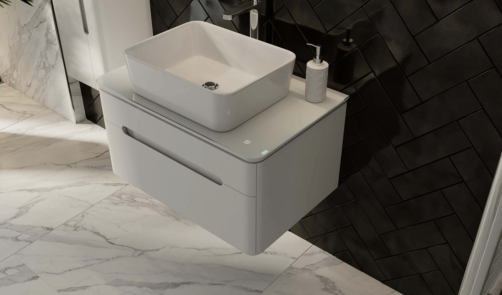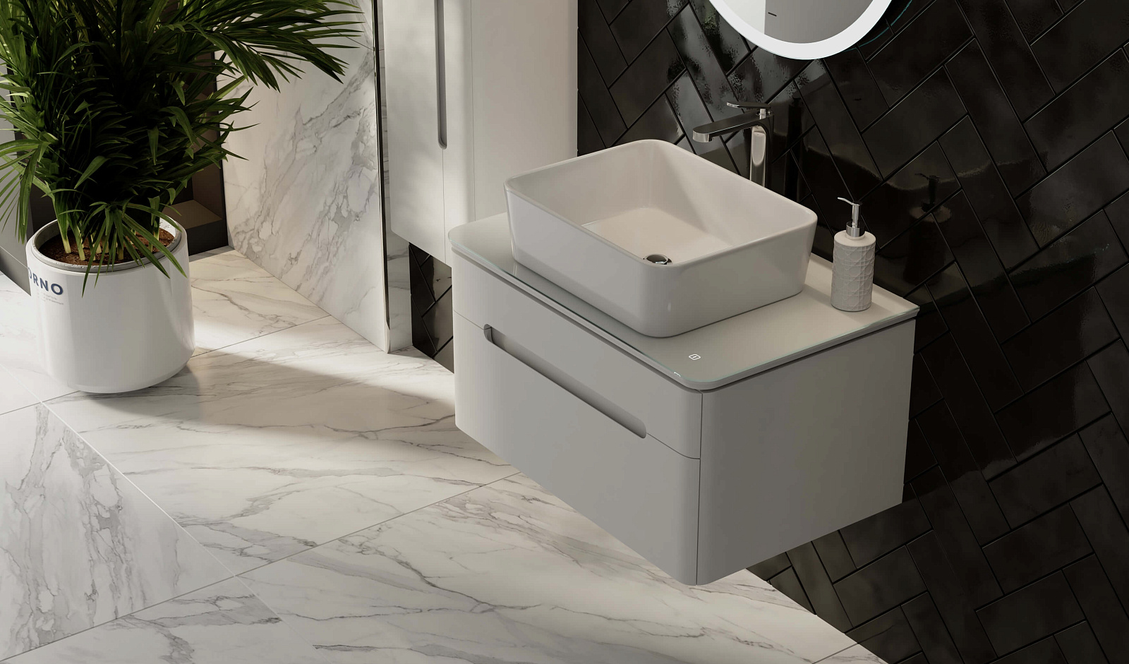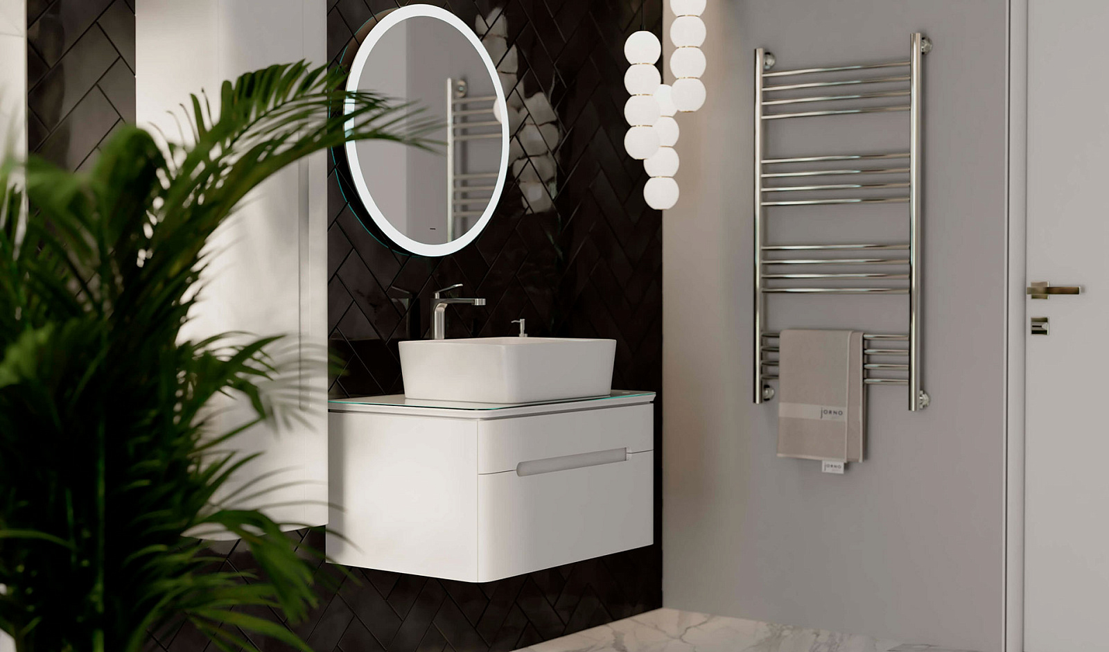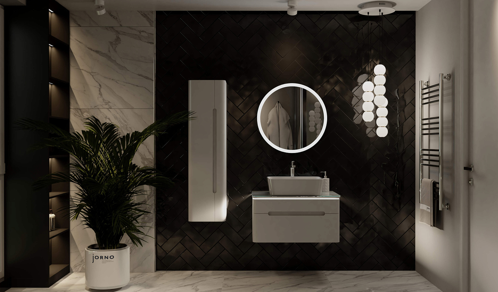 Нижний свет тумбы создает ощущение плавности в пространстве интерьера. Зеркало со светодиодной подсветкой в сочетании со столешницей из стекла Lacobel придает легкость композиции.