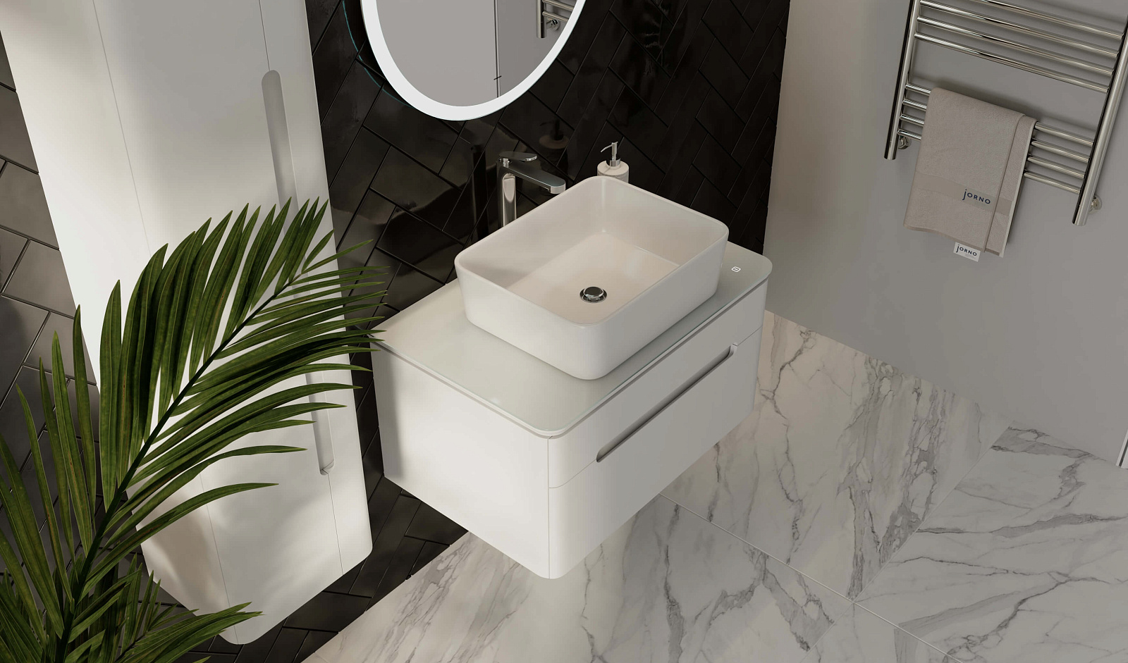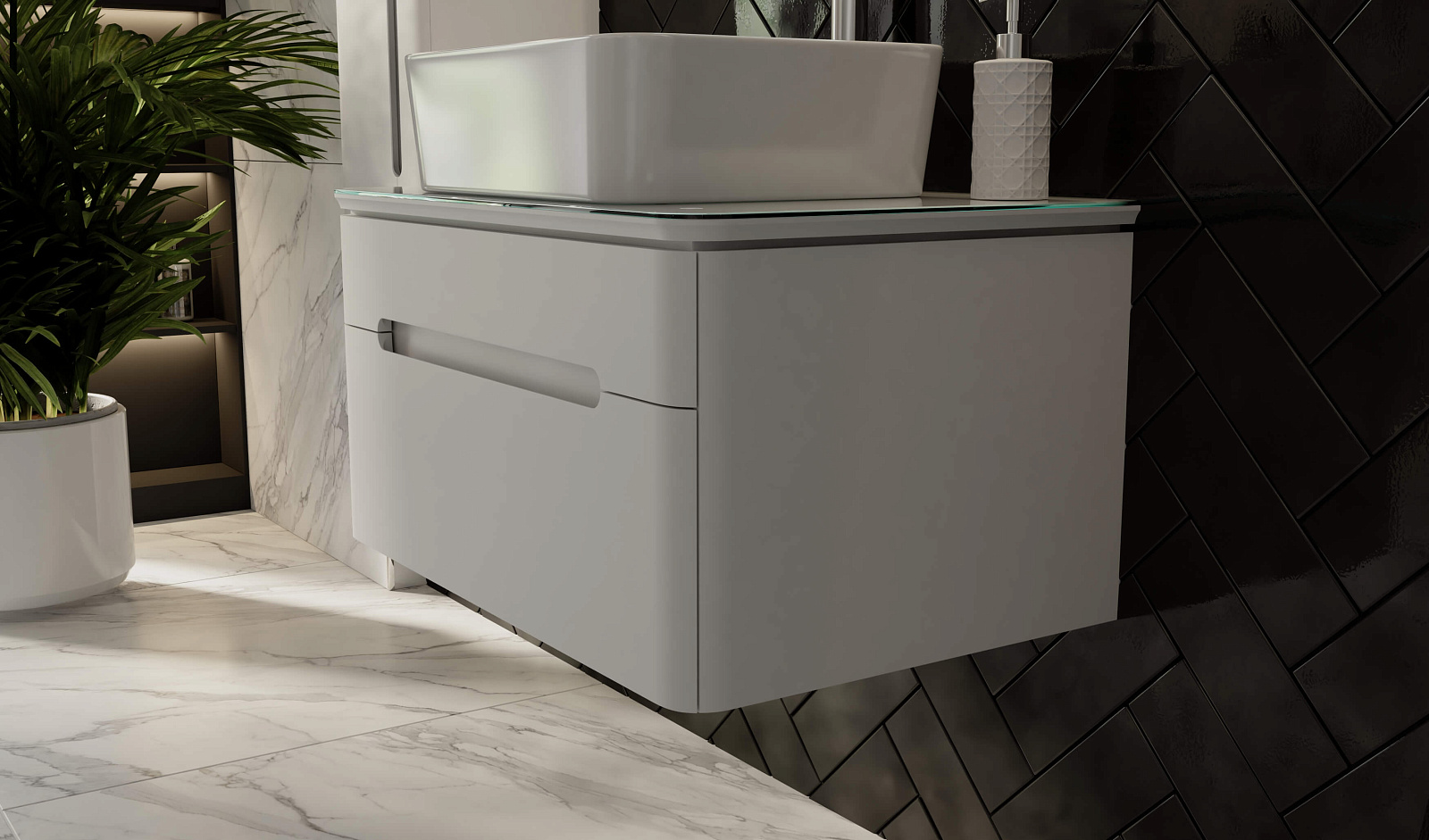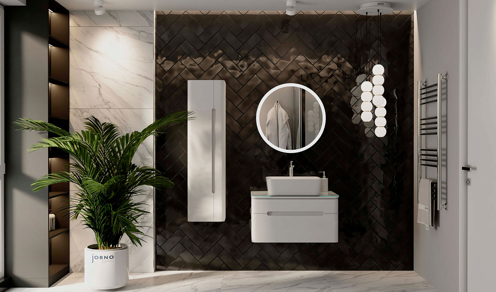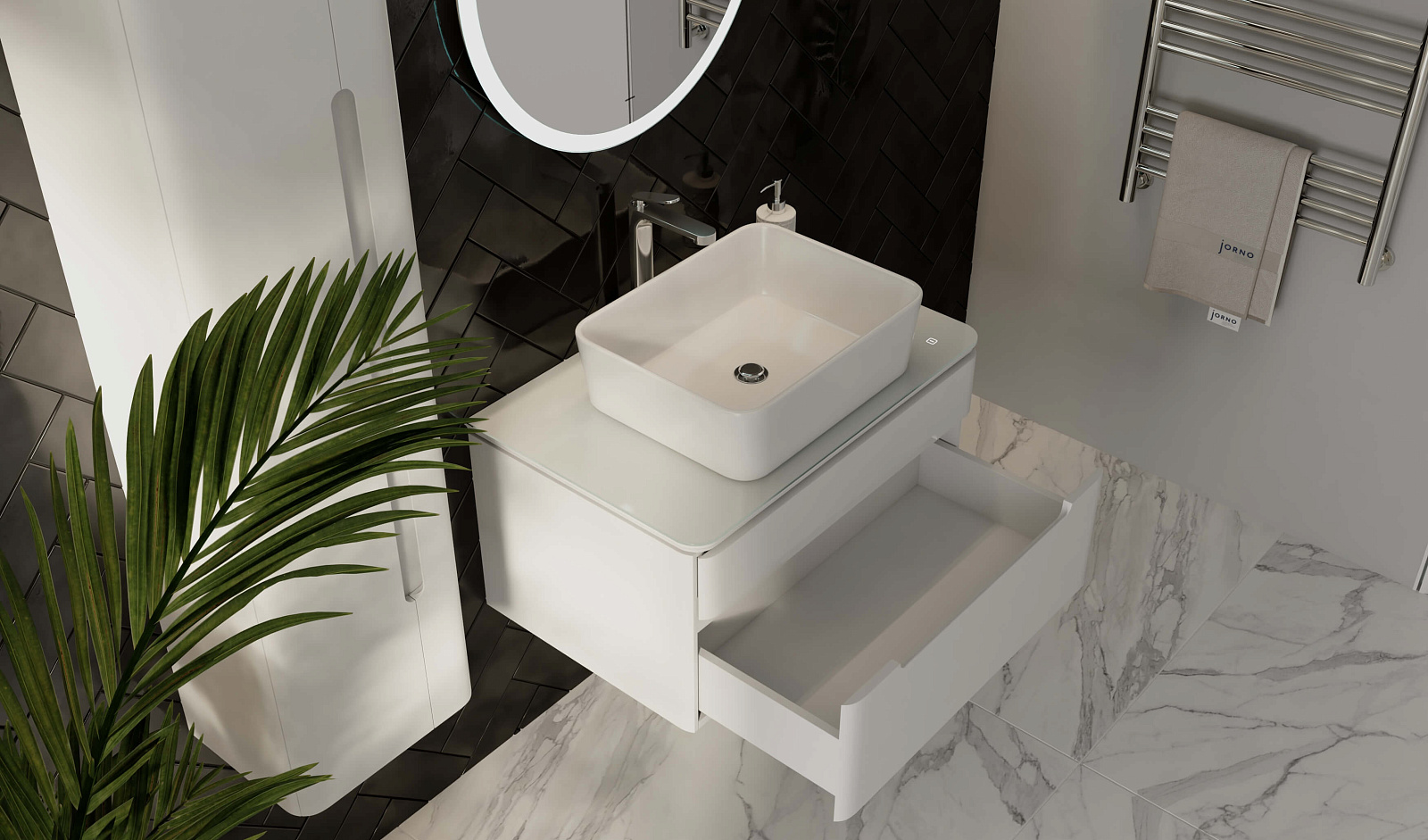 Нижний свет тумбы создает ощущение плавности в пространстве интерьера. Зеркало со светодиодной подсветкой в сочетании со столешницей из стекла Lacobel придает легкость композиции.