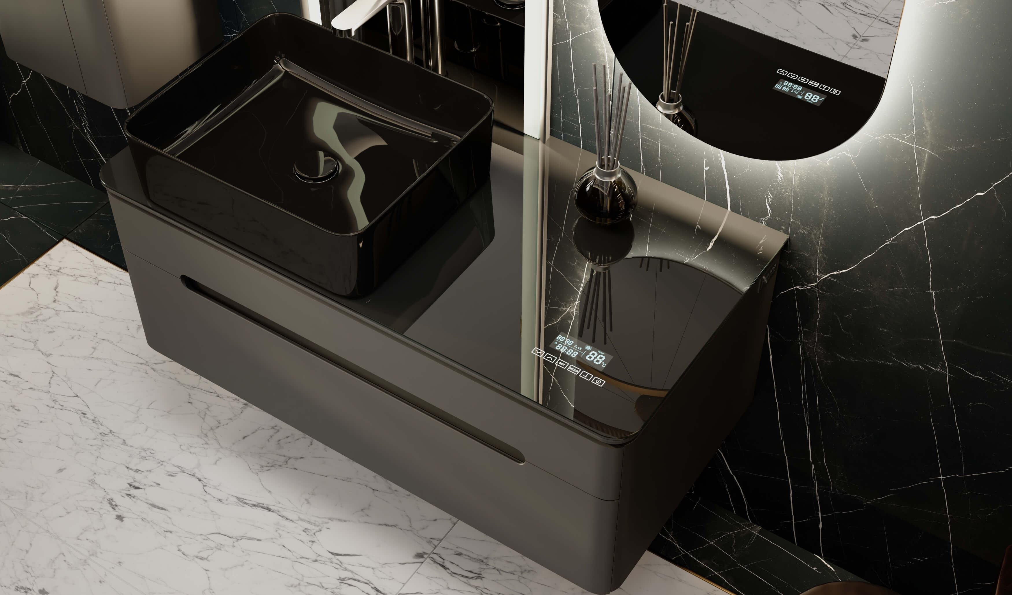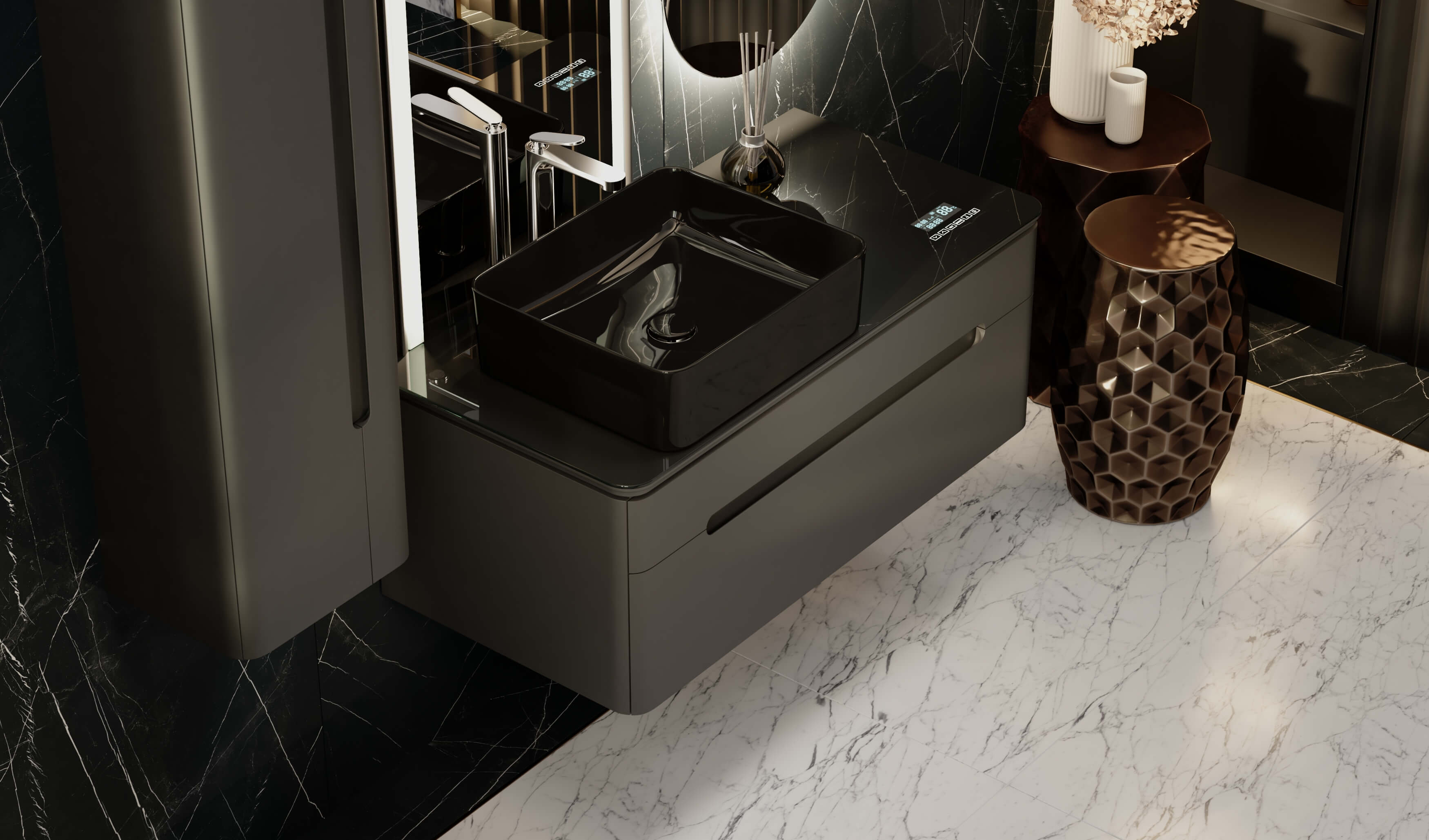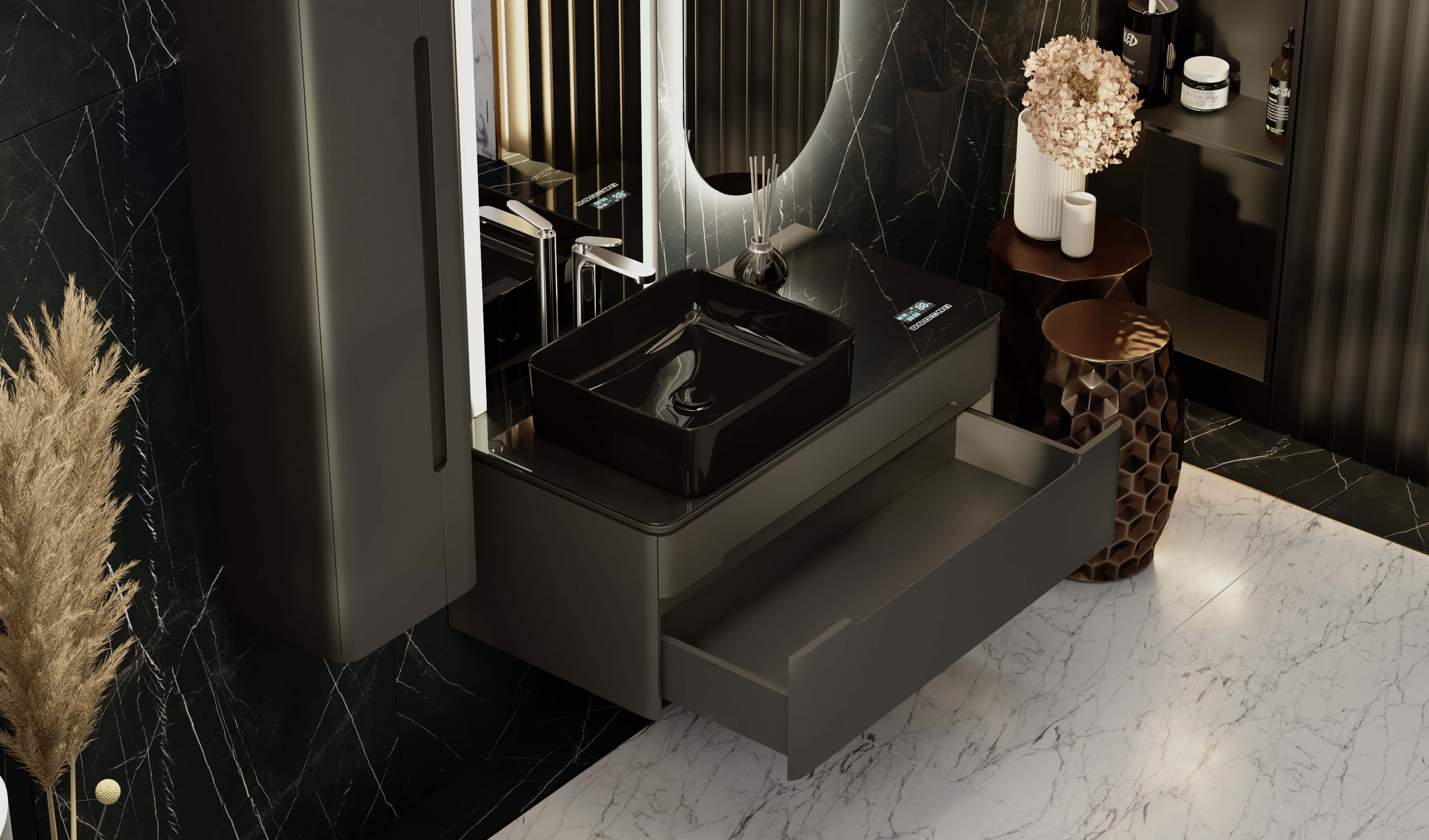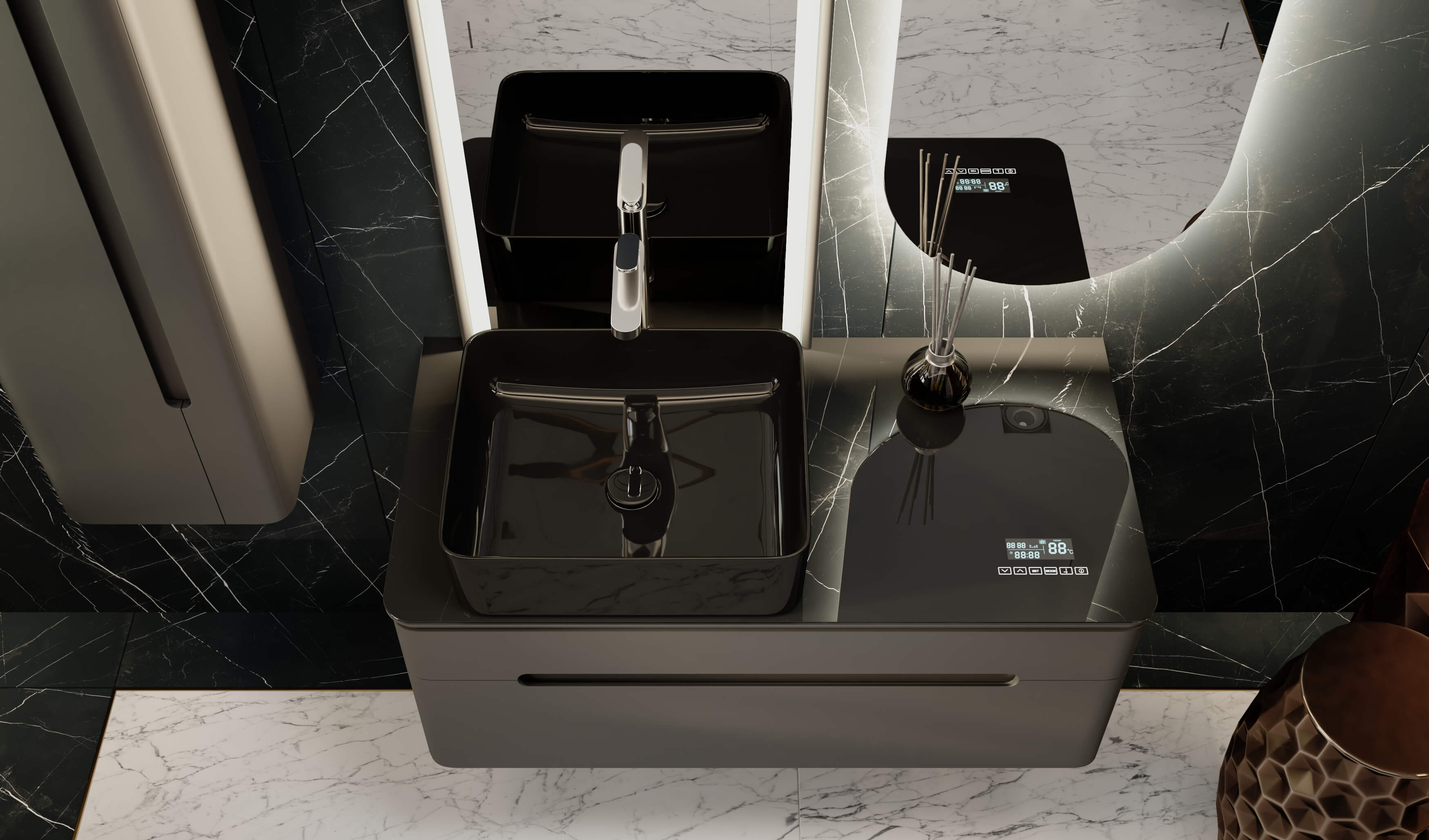 Тумбы оснащены МФУ (встроенный в столешницу многофункциональный модуль, который показывает температуру, время и дату, а также Bluetooth система с двумя динамиками).