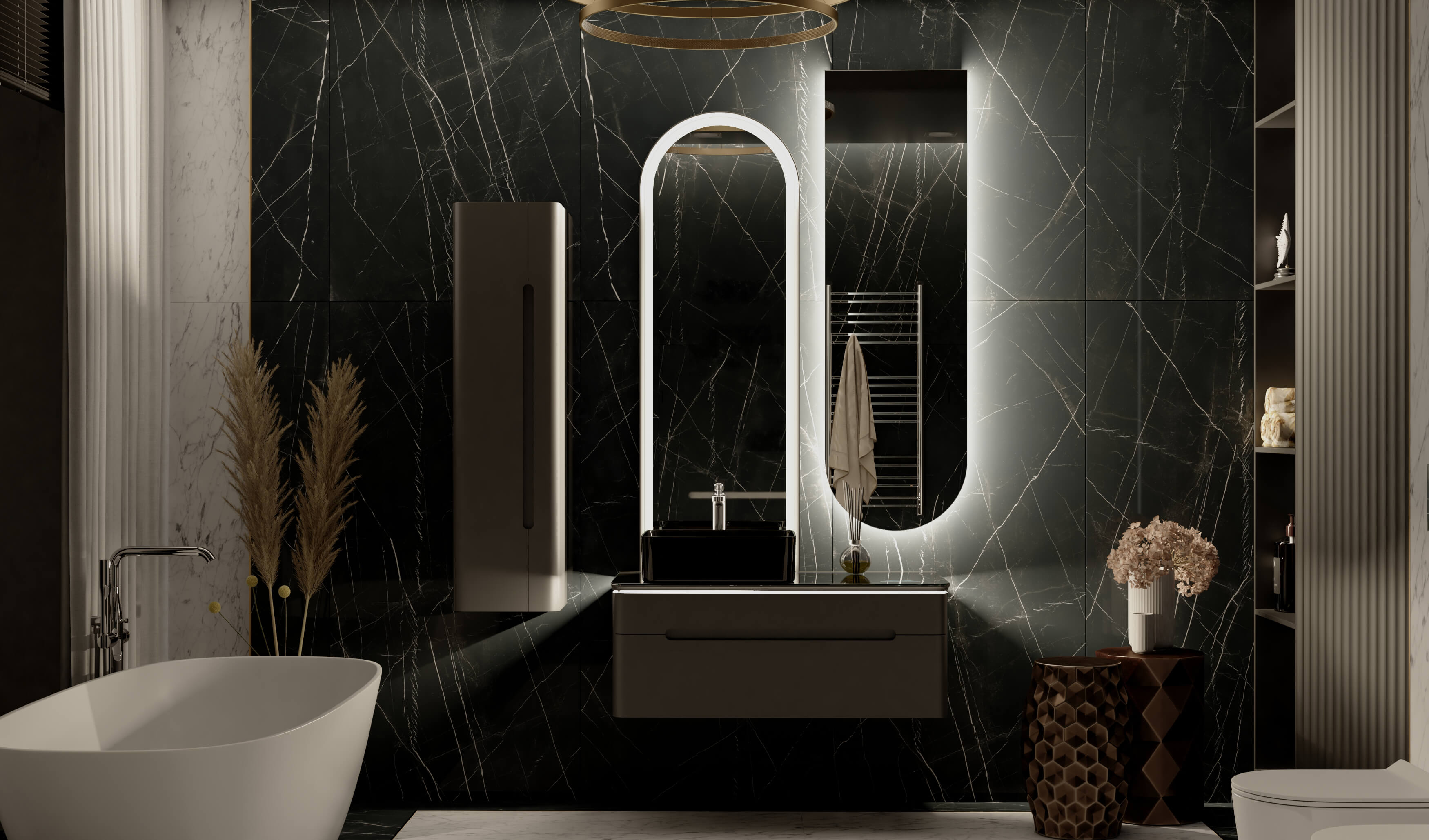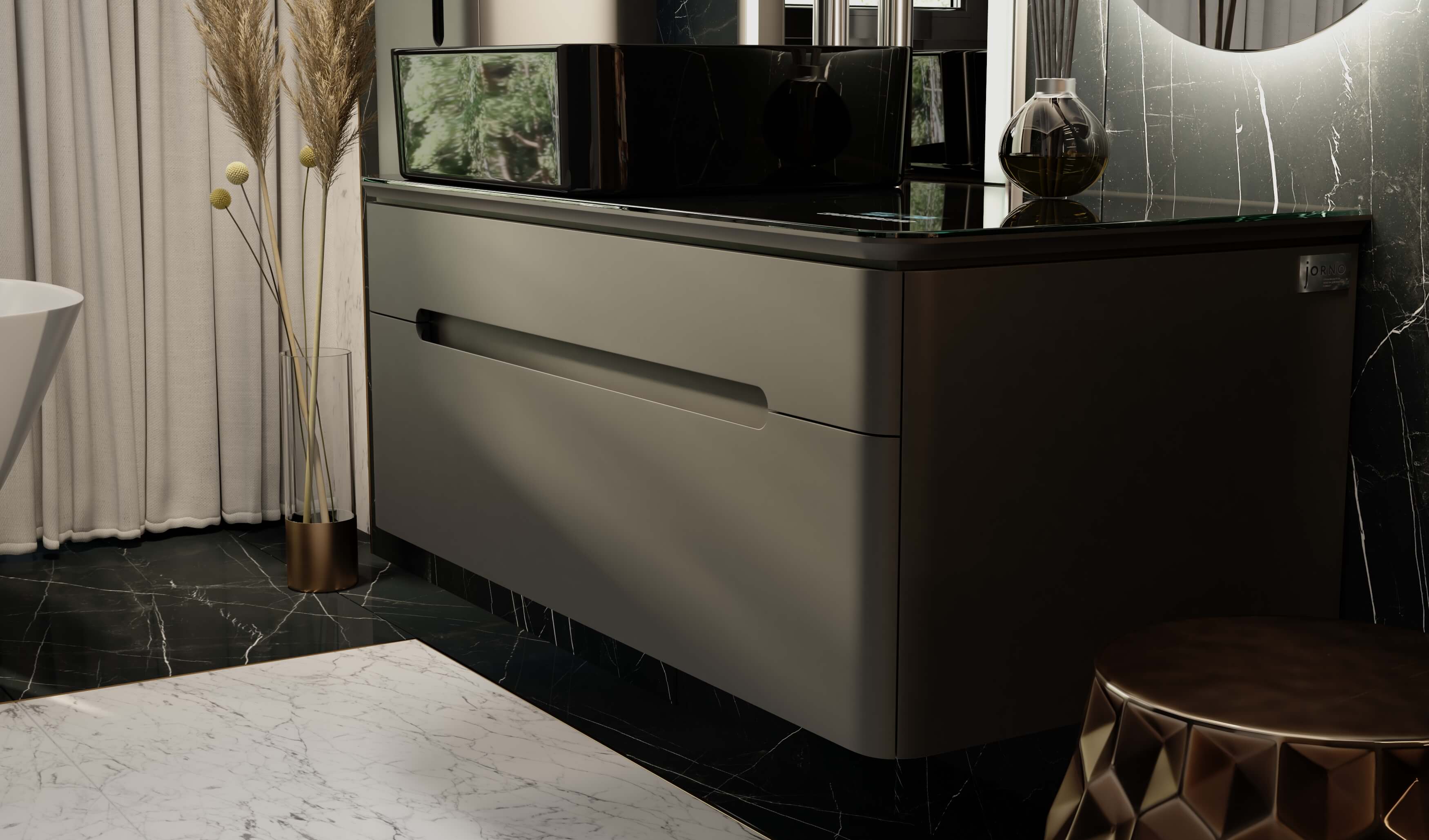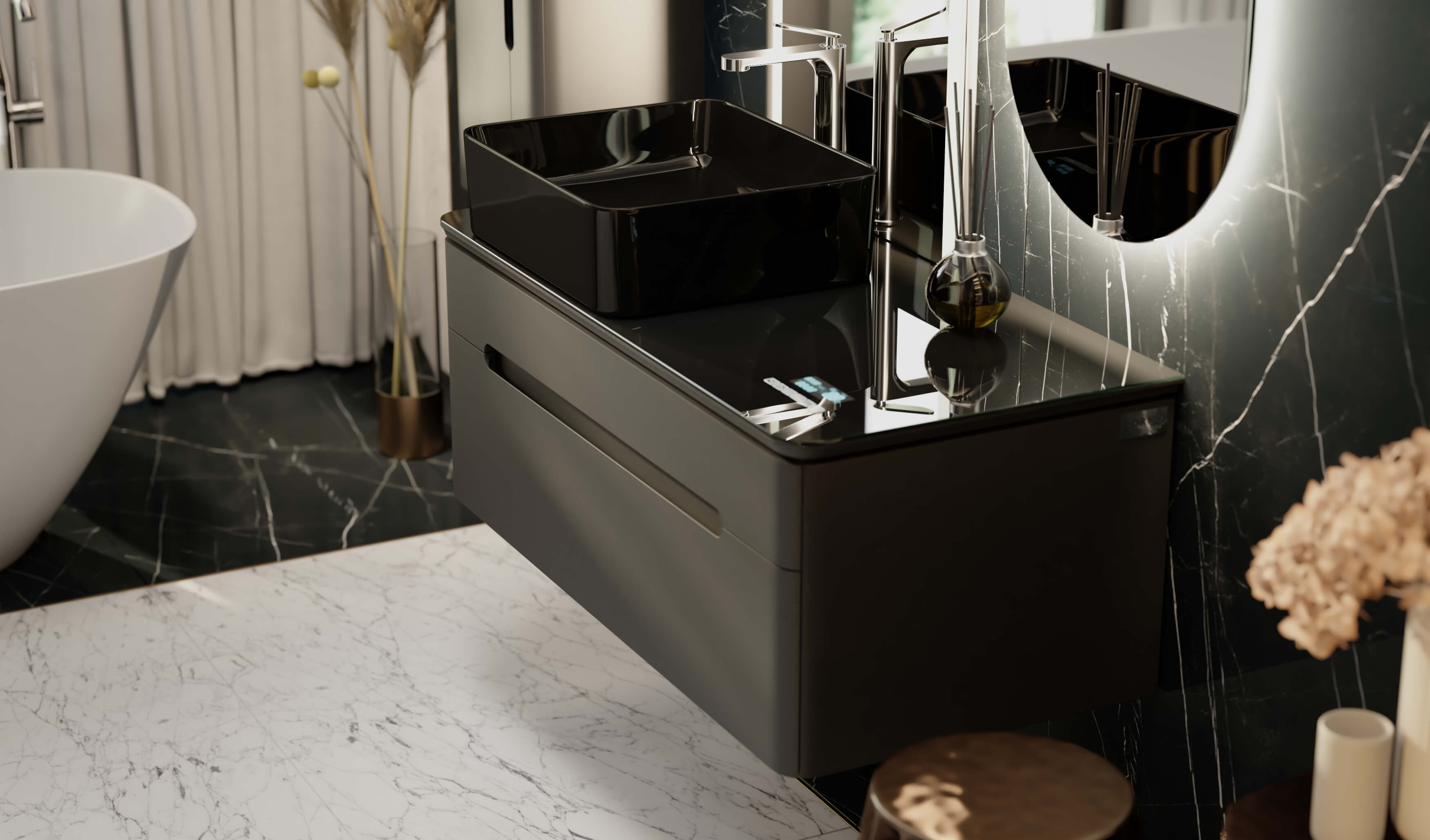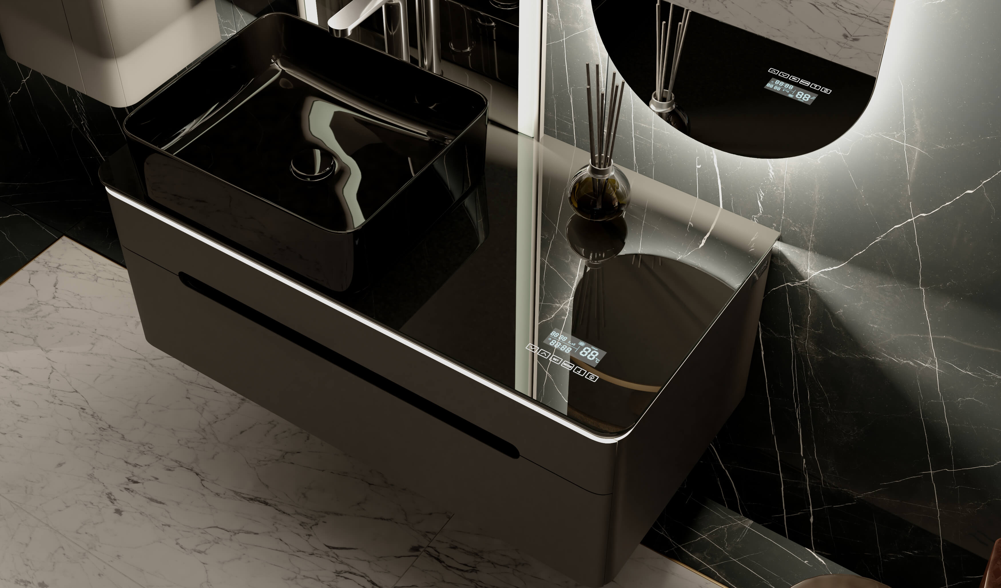 Тумбы оснащены МФУ (встроенный в столешницу многофункциональный модуль, который показывает температуру, время и дату, а также Bluetooth система с двумя динамиками).