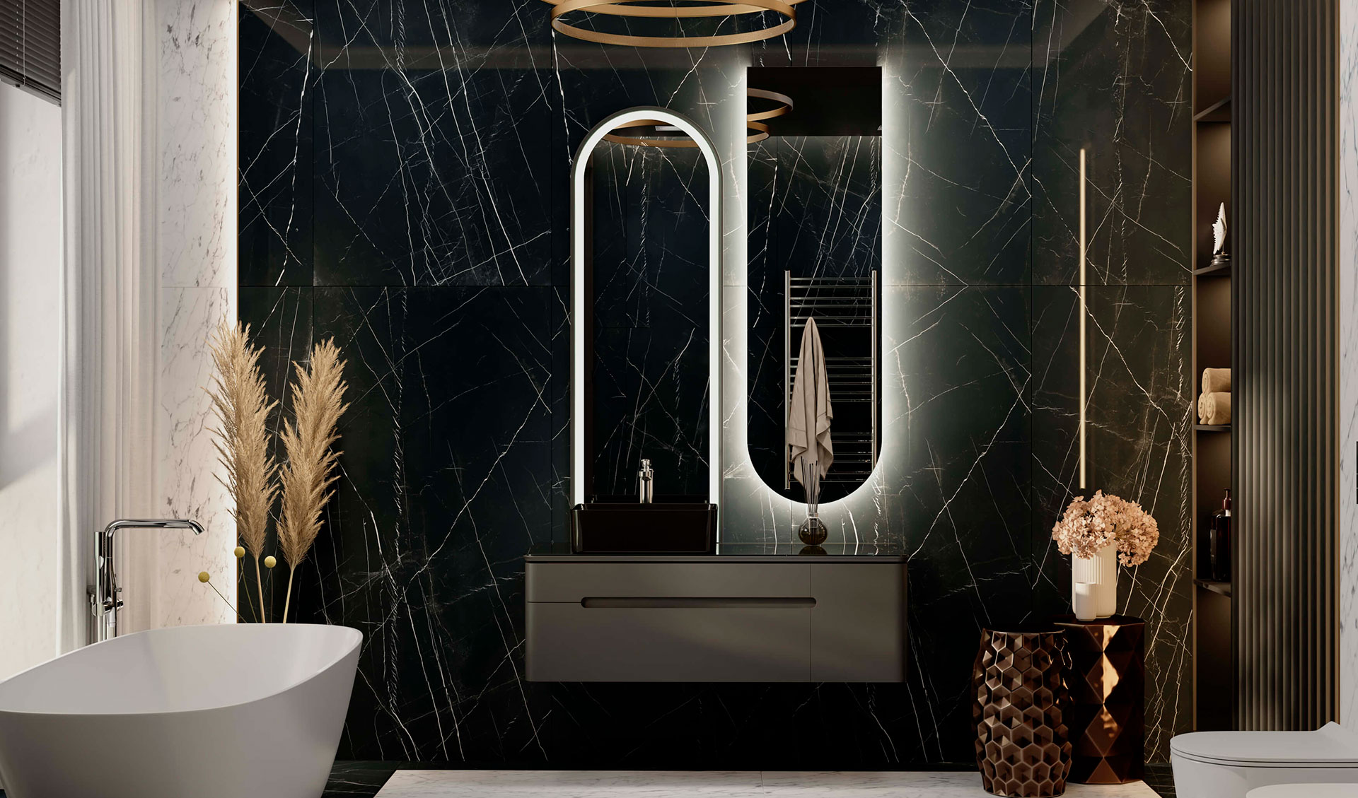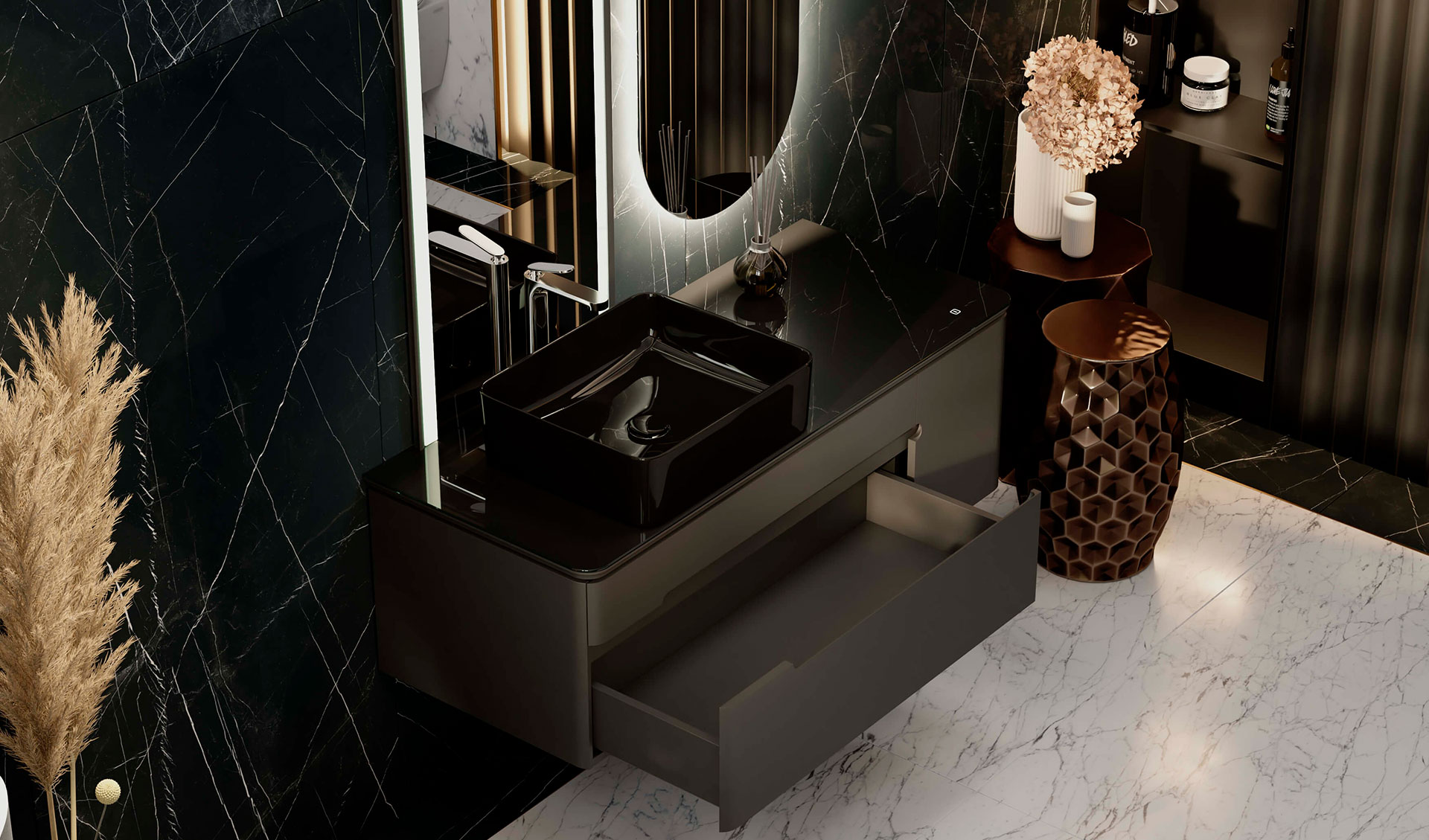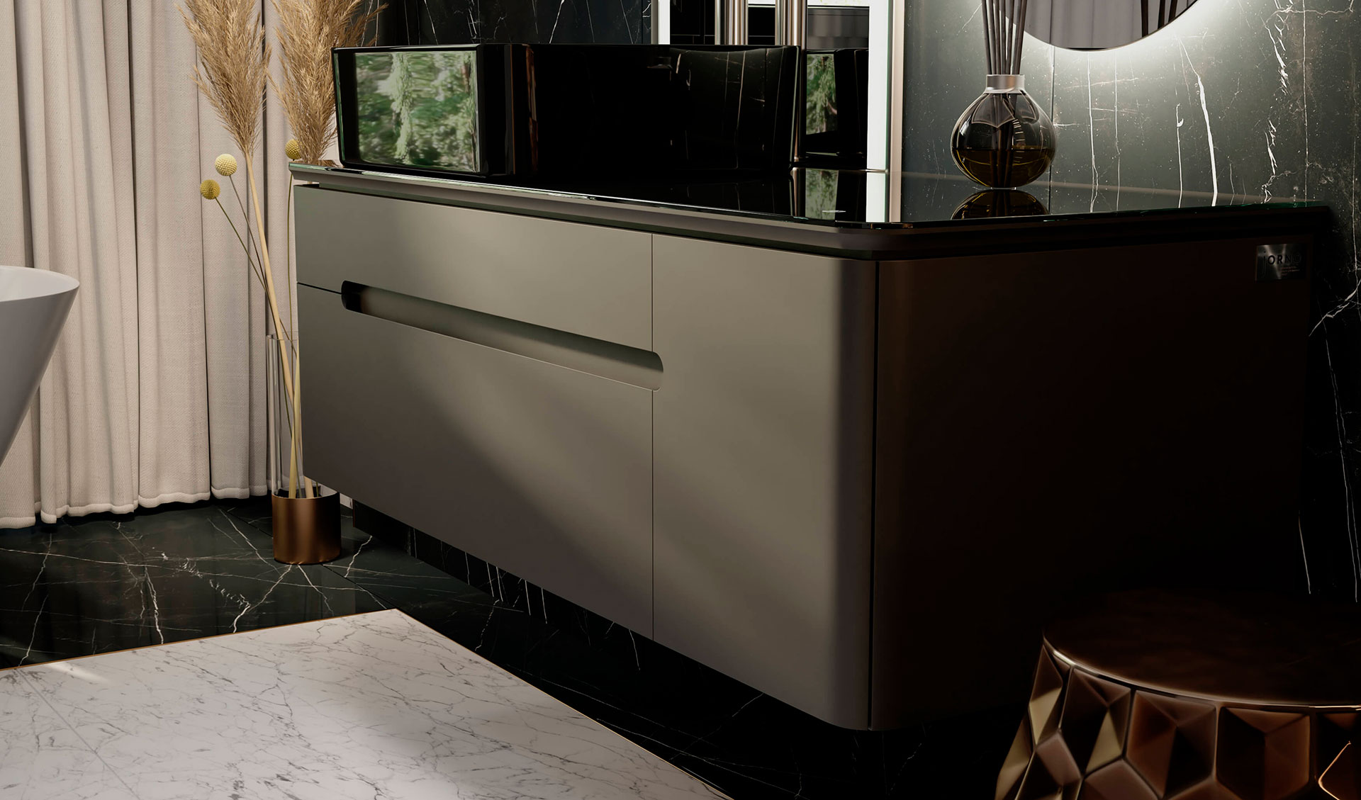 Подсветка Колизея и повторяющиеся арки подарили образ плавных линий, которые воплотились в коллекции Shine. Нижний свет тумбы создает ощущение плавности в пространстве интерьера. Столешница из стекла Lacobel придает легкость композиции.