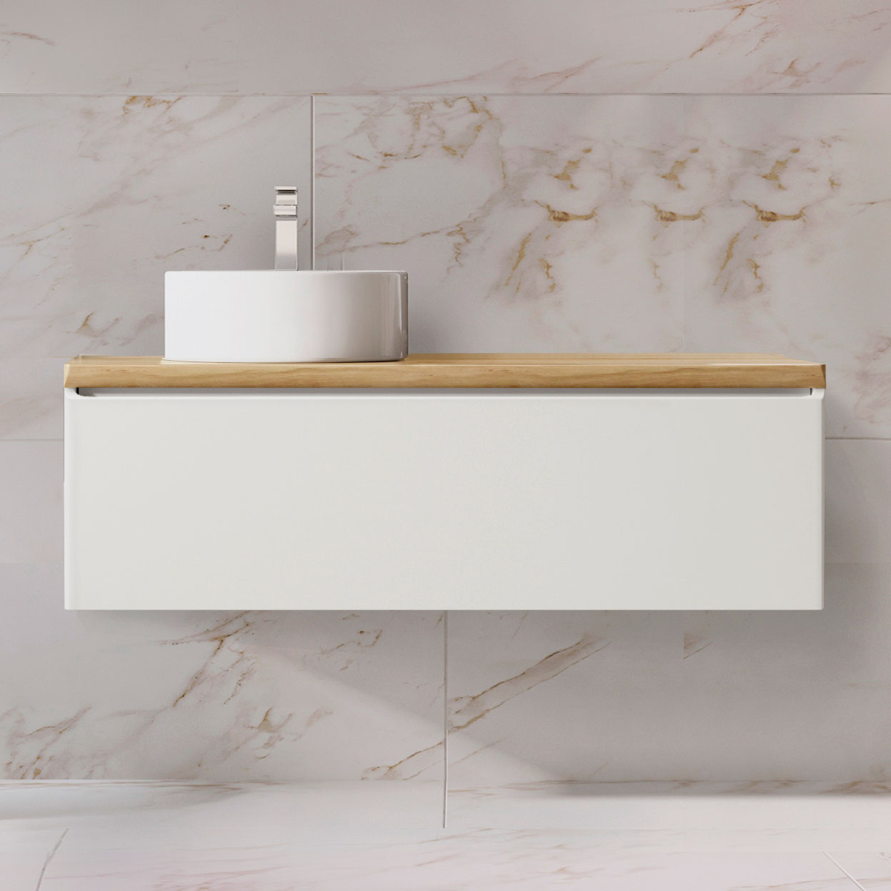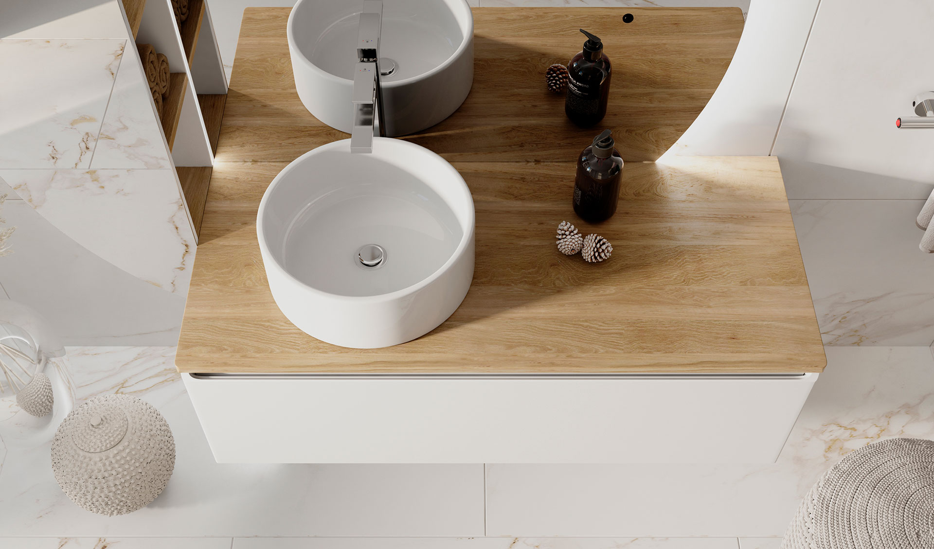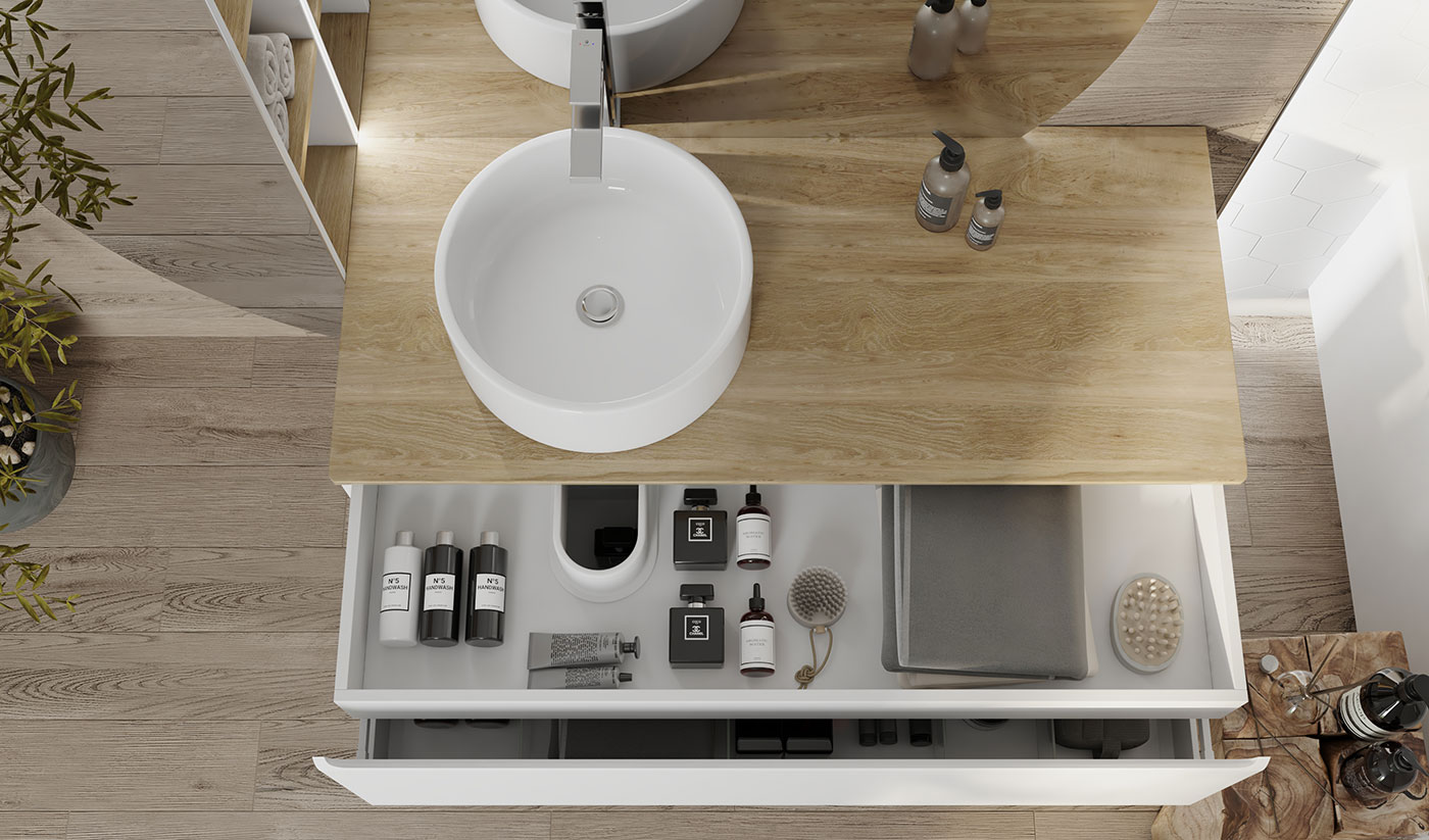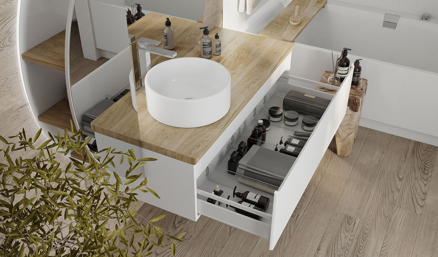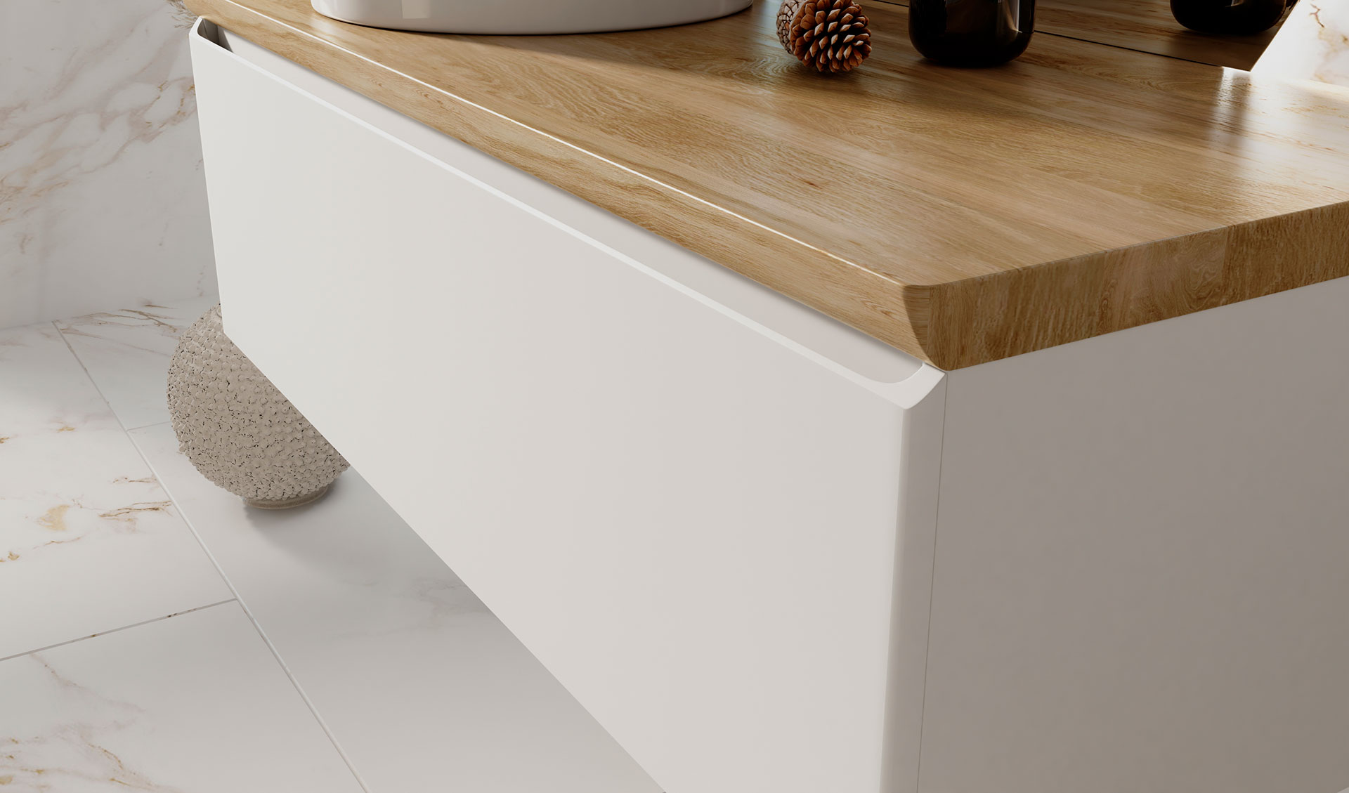 Тумба для ванной Solis устойчива к царапинам и перепадам температур. Корпус тумбы с изящной интегрированной ручкой на фасаде выполнен влагостойких материалов. Столешница из массива бука.