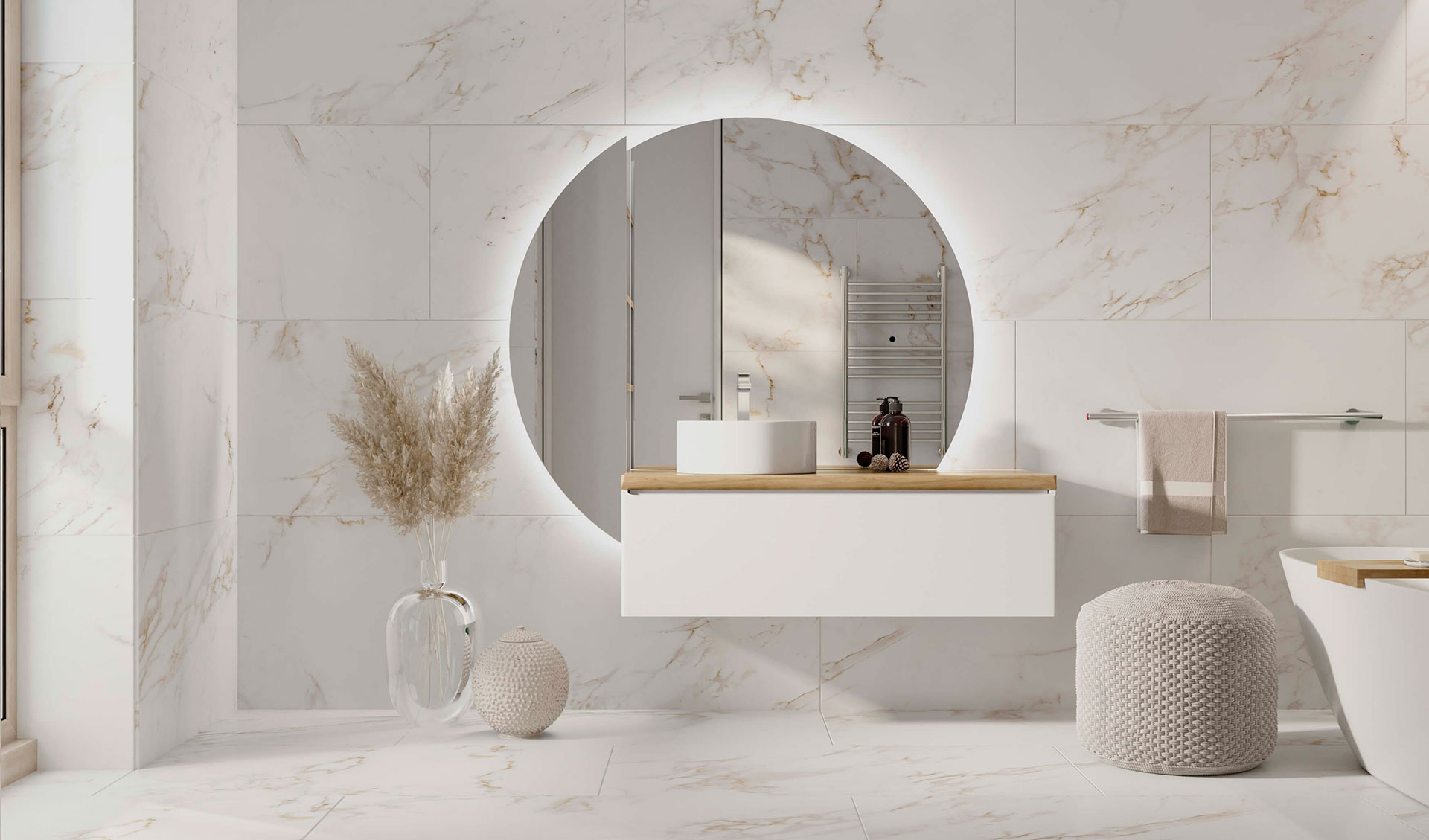 Вариативность комплектации зеркала позволяет адаптировать коллекцию по ширине, функционалу и визуальному богатству образа. Большое круглое зеркало с подсветкой по периметру, напоминающее солнечный диск, увеличивает пространство ванной комнаты, смягчает его и придает гармонию интерьеру ванной комнаты. Светодиодная подсветка зеркала оснащена бесконтактным выключателем. Пенал, встроенный в зеркало, имеет дополнительную вертикальную подсветку.