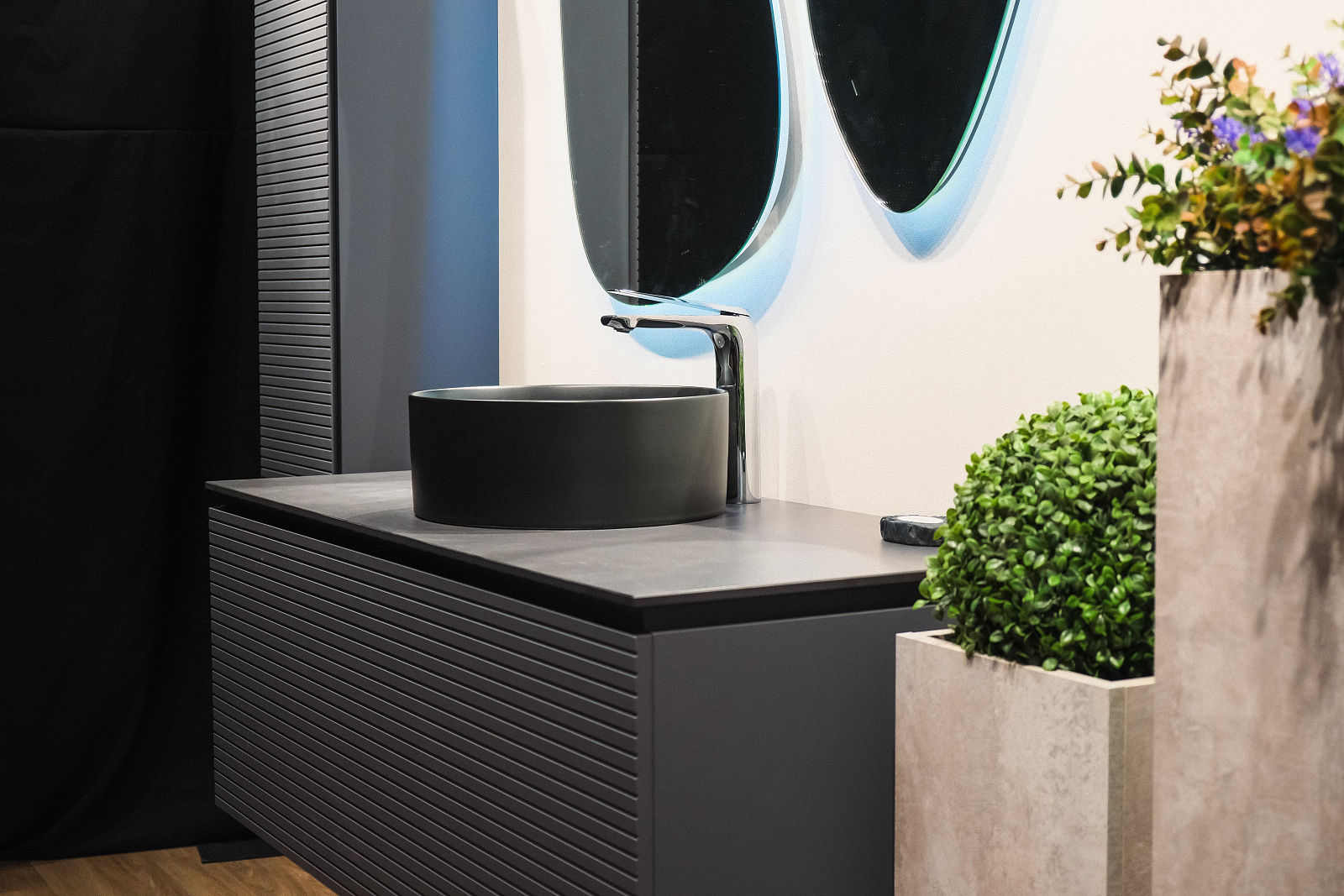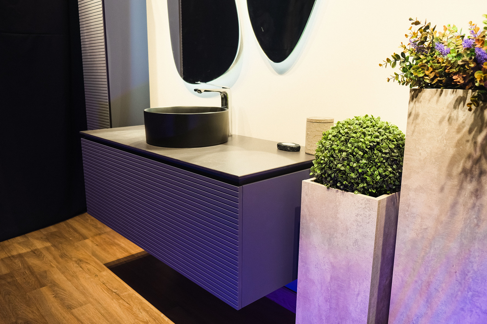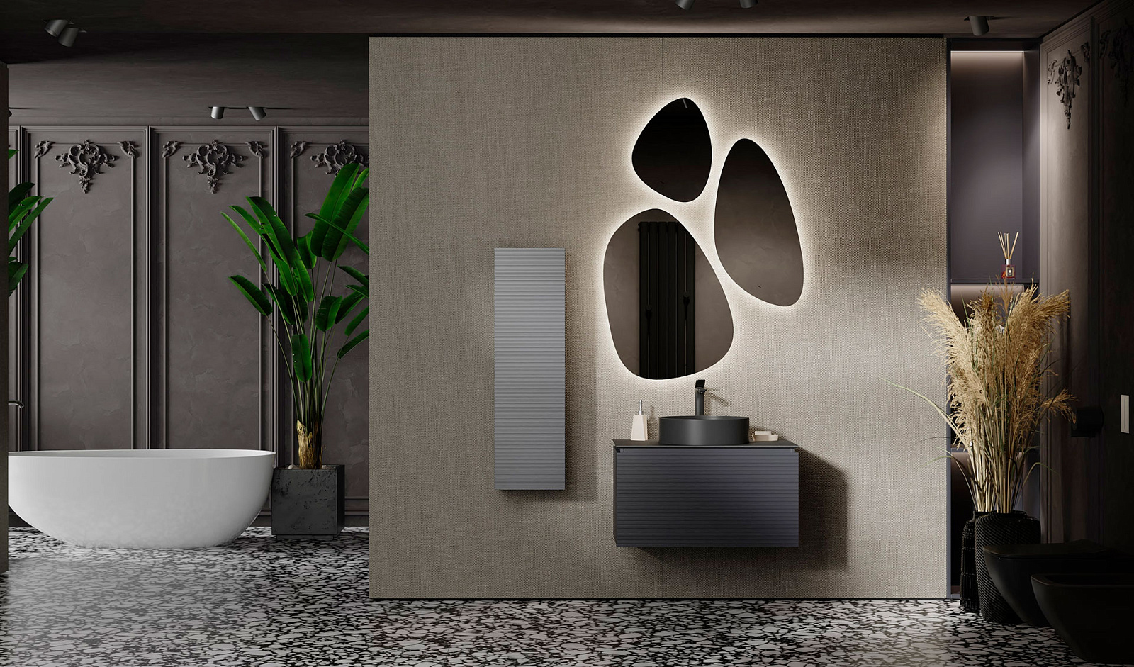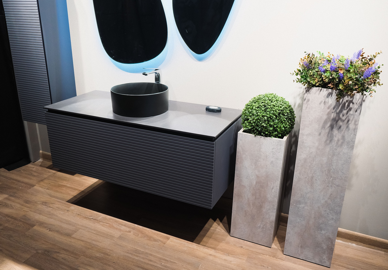 Эффектная и геометричная тумба выполнена из влагостойких материалов.