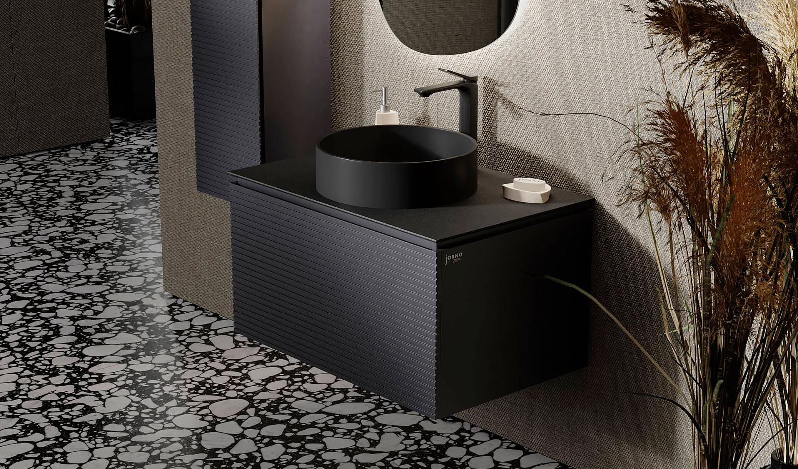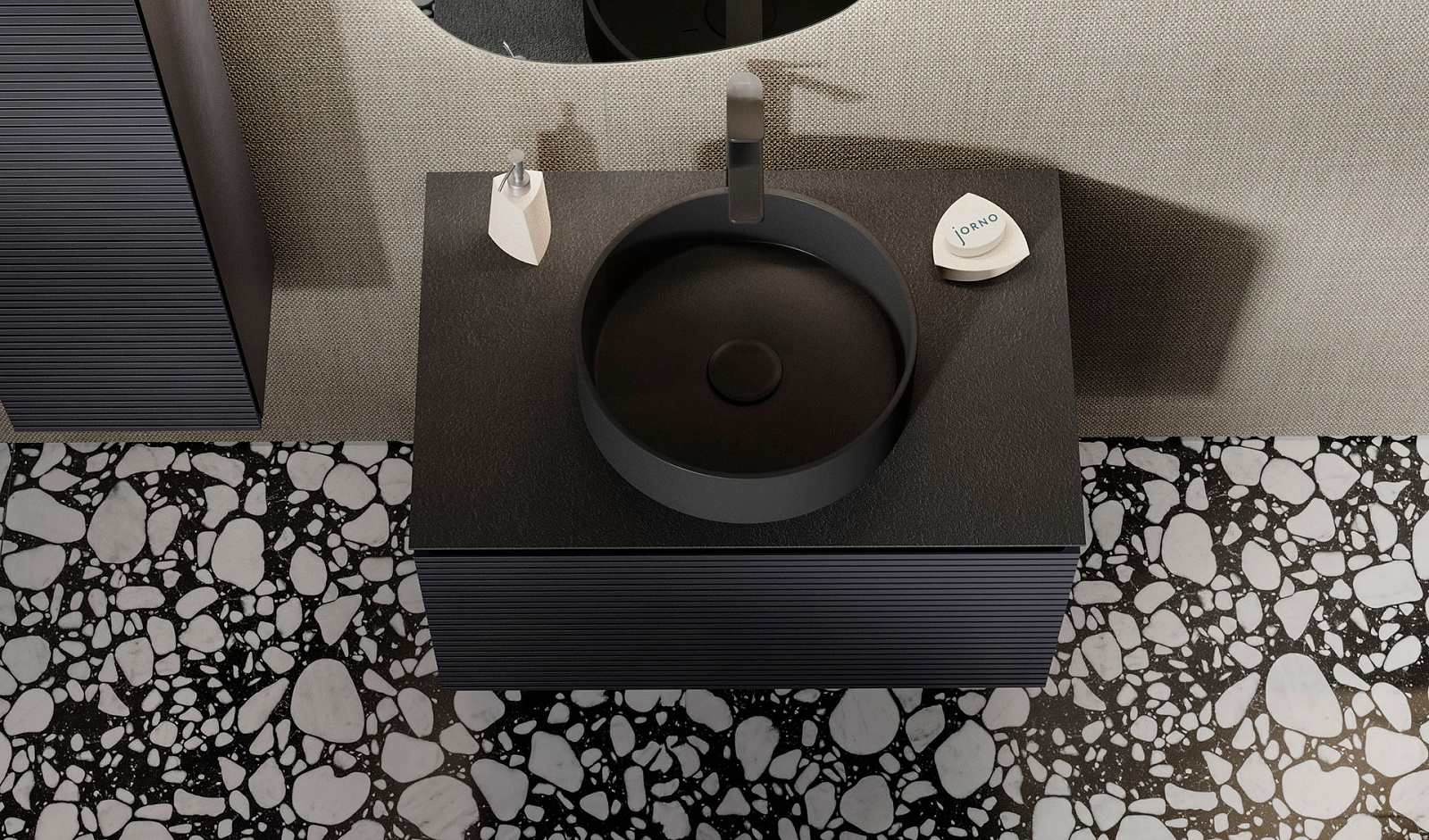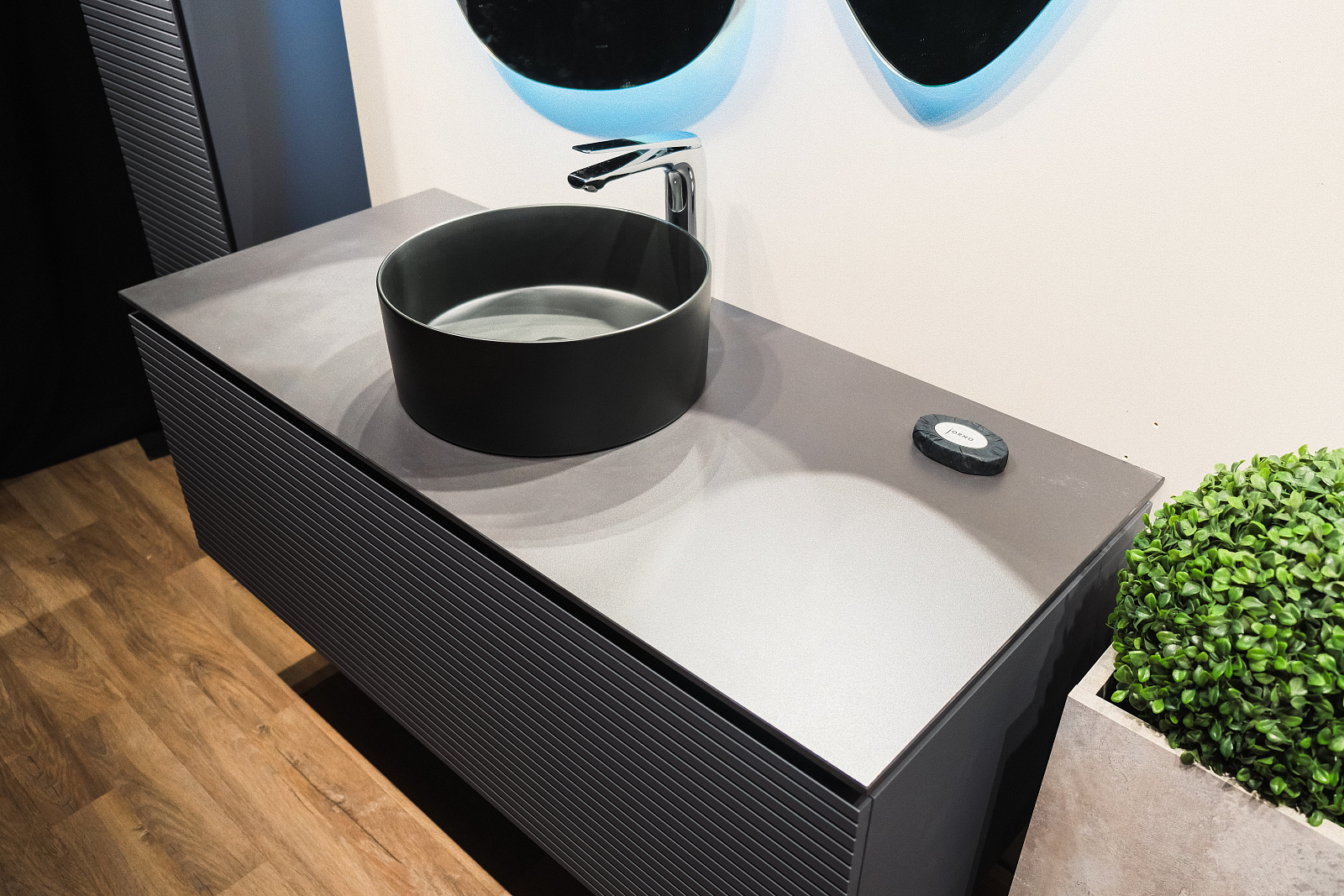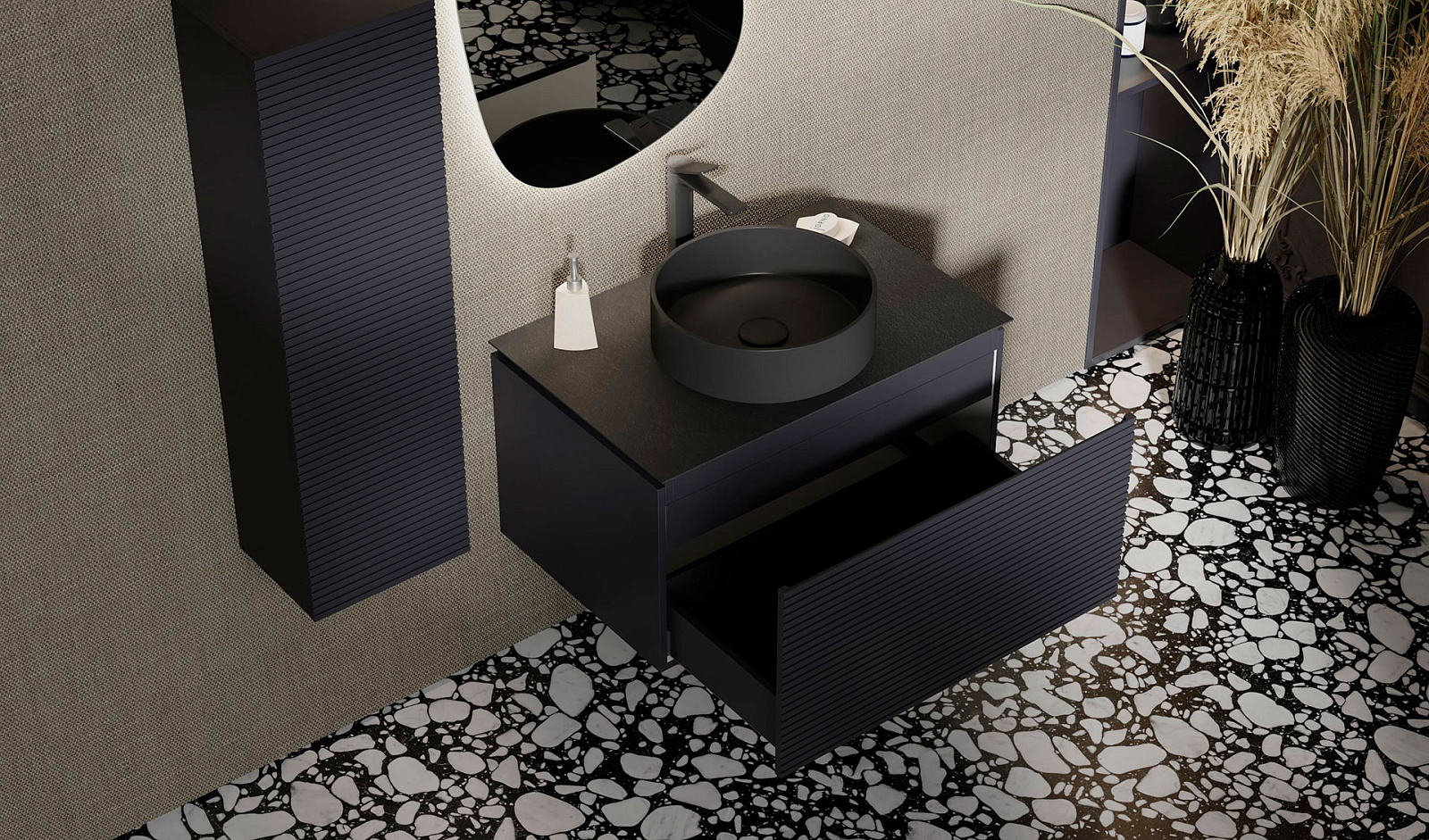Эффектная и геометричная тумба выполнена из влагостойких материалов.