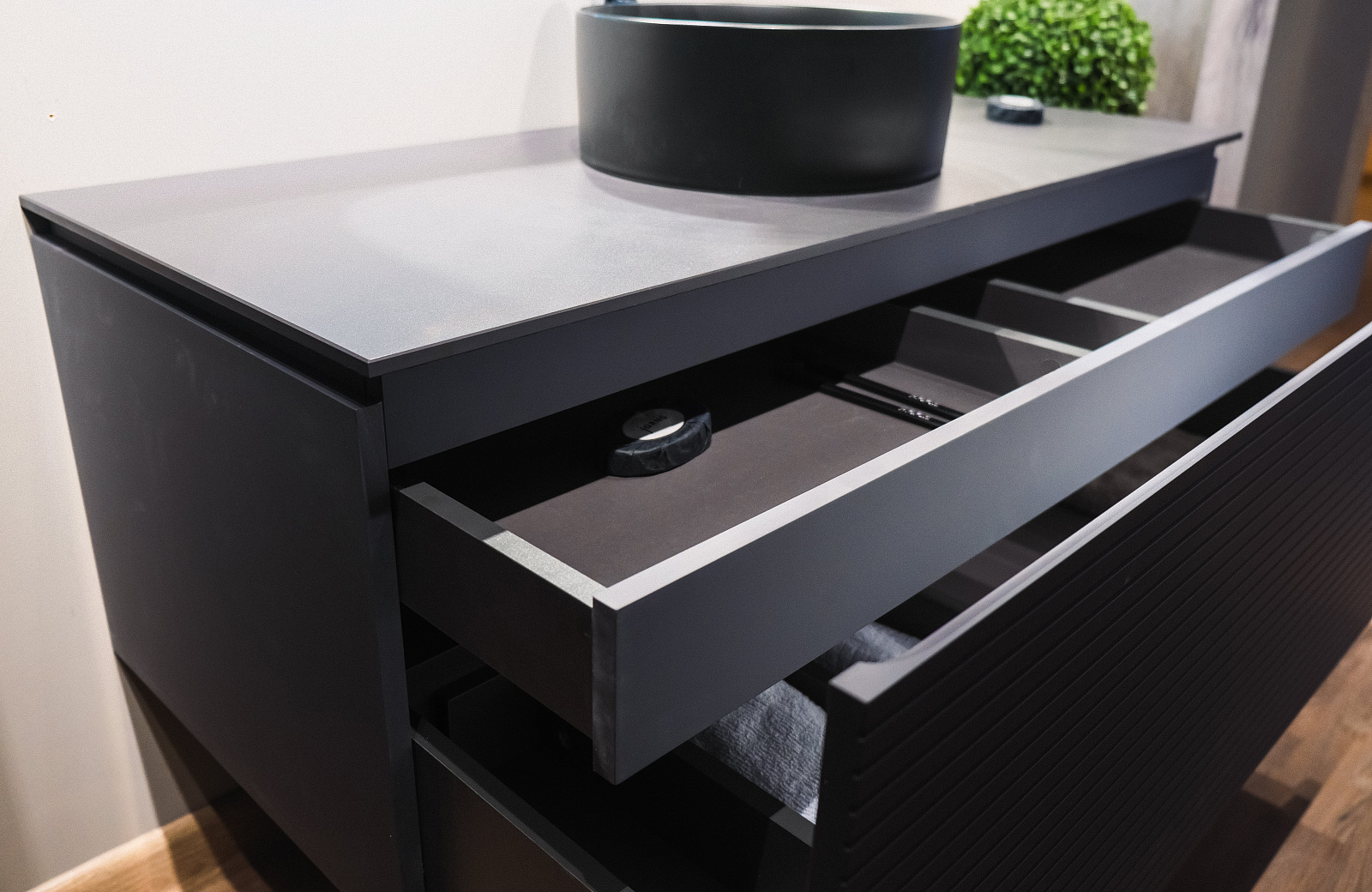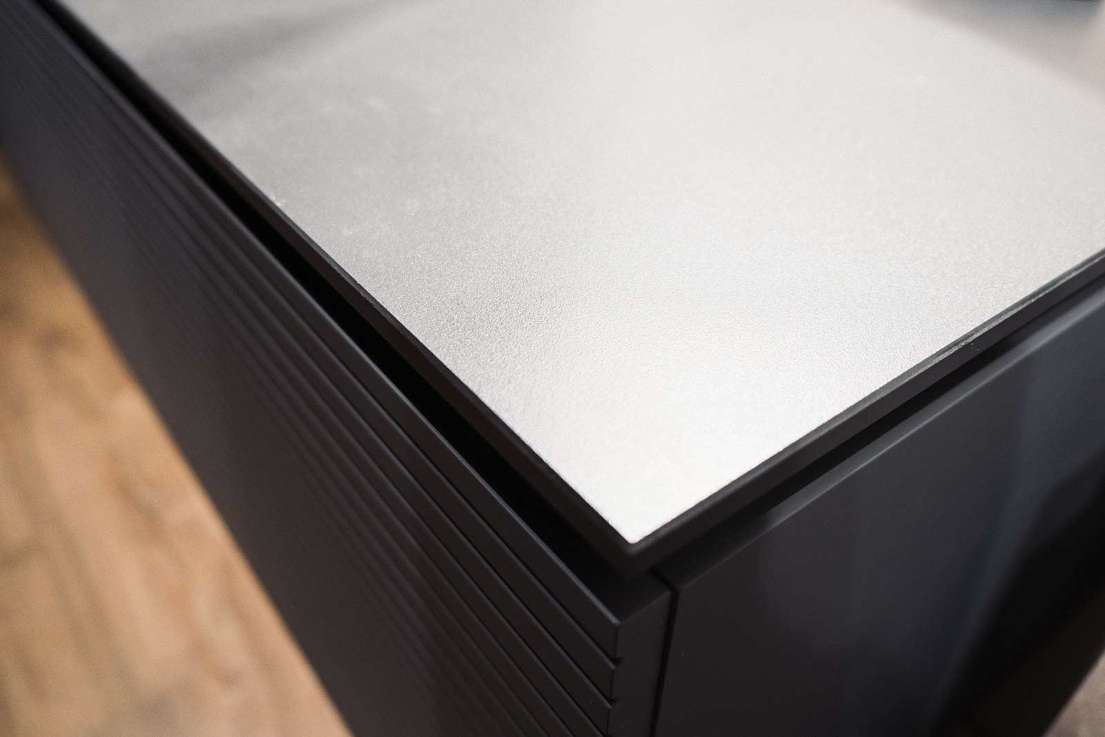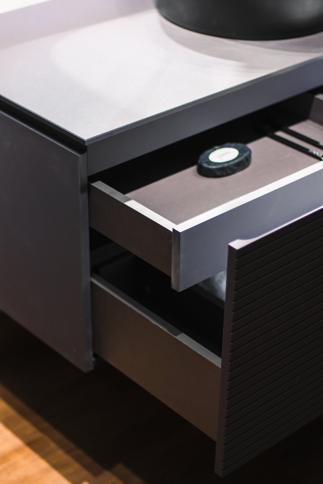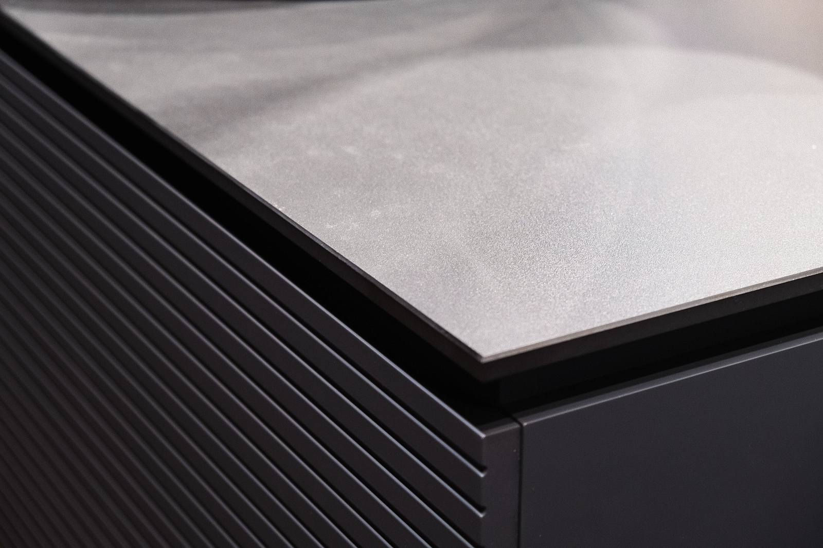 Столешница из керамогранита в сочетании с горизонтальной фрезеровкой фасадов, передает стиль жизни городского человека.