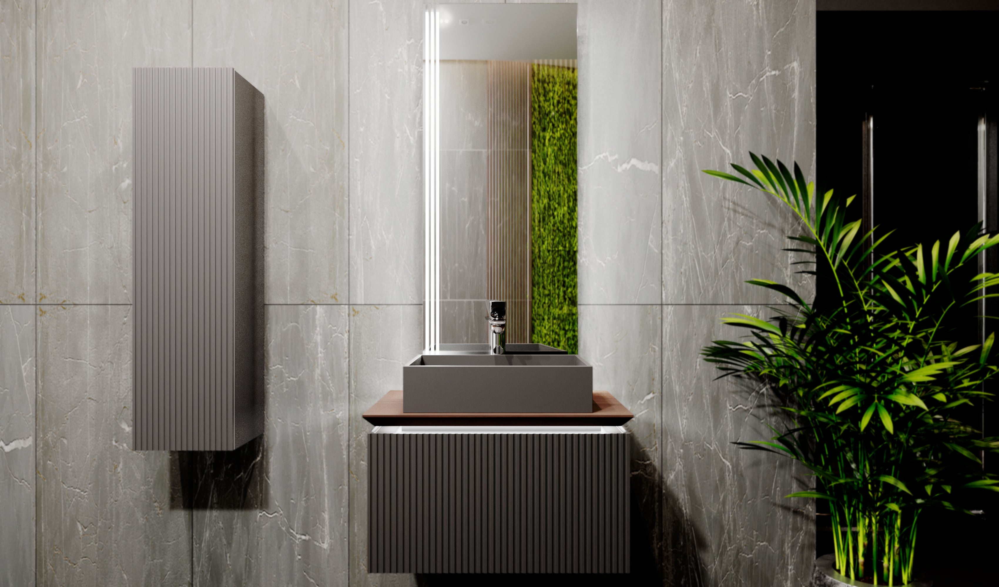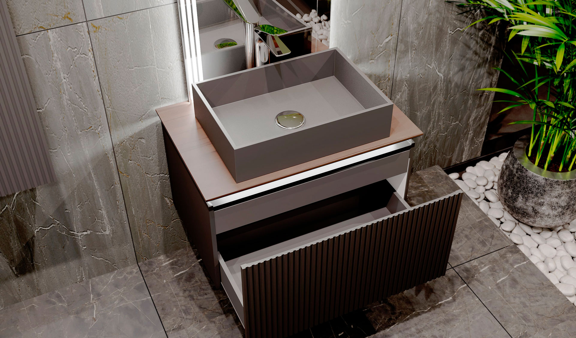 Столешница из цельного массива бука, которому придали темный оттенок и влагостойкость, оснащена подсветкой. Внутри тумбы есть скрытый ящик для хранения мелочей. ВАЖНО! При выборе смесителя просьба обратить внимание на схему столешницы. Мы рекомендуем устанавливать сенсорный смеситель или смеситель с боковым открыванием.