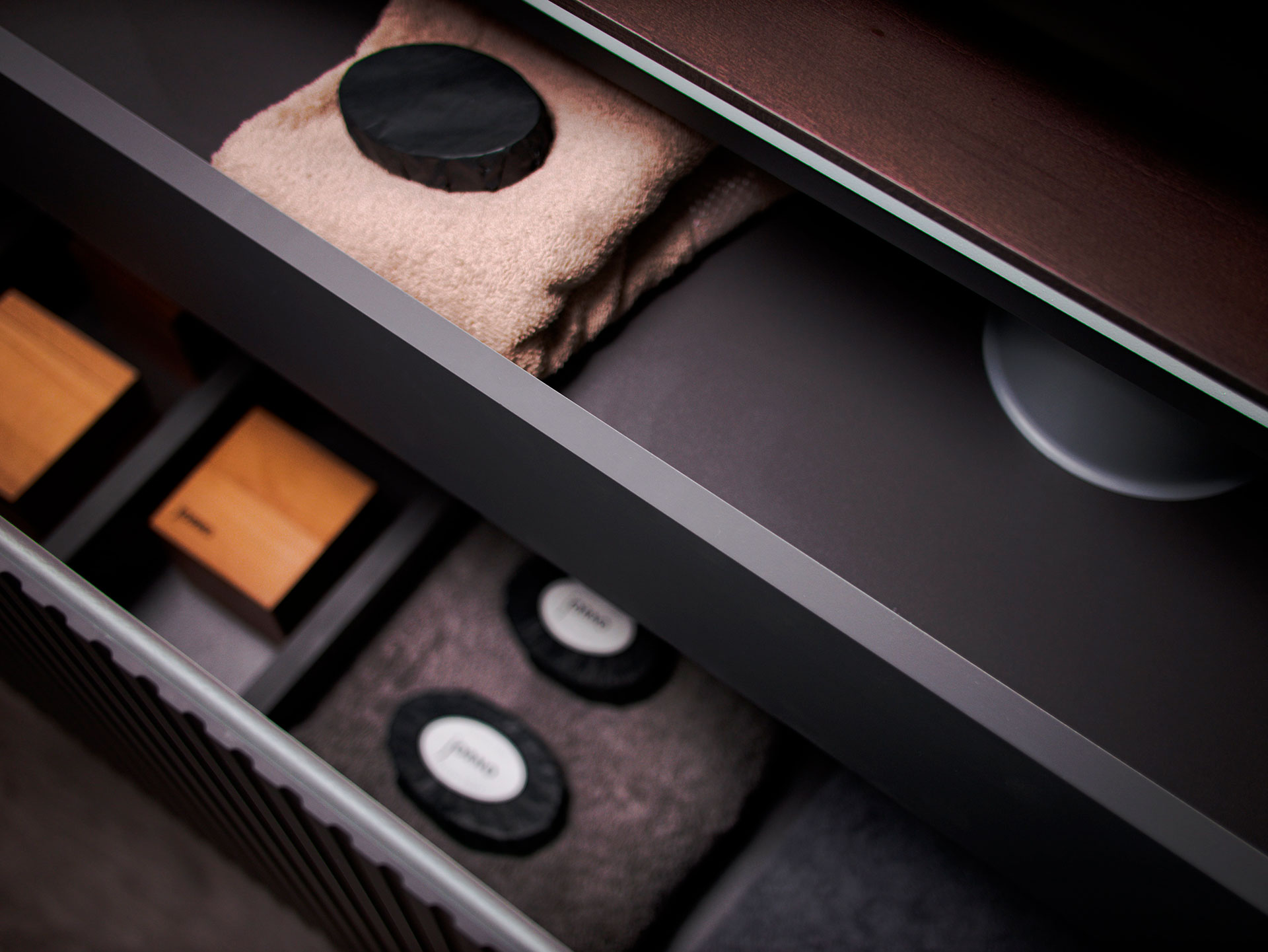Коллекция Strong пропитана величием римской архитектуры с ее повторяющимися колоннами и арками, монументальными опорами, отражая при этом непринужденность современной городской жизни. Натуральное дерево в сочетании с тонкими линиями краев столешницы и повторяющимися линиями на фасаде, создают баланс брутальности и утонченности.