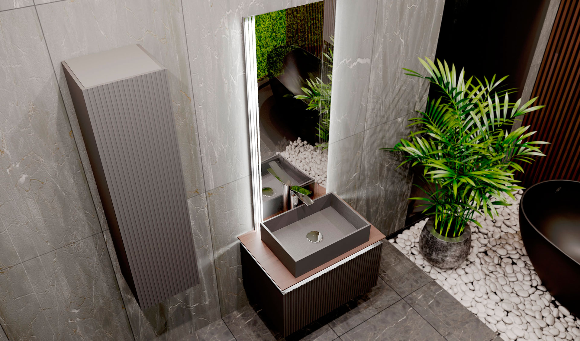 Фасад и боковины тумбы комплекта выполнены из МДФ, покрытого матовой пленкой графитового оттенка. Внутри и снаружи тумба выполнена в одном цвете, что создает цельность образа.