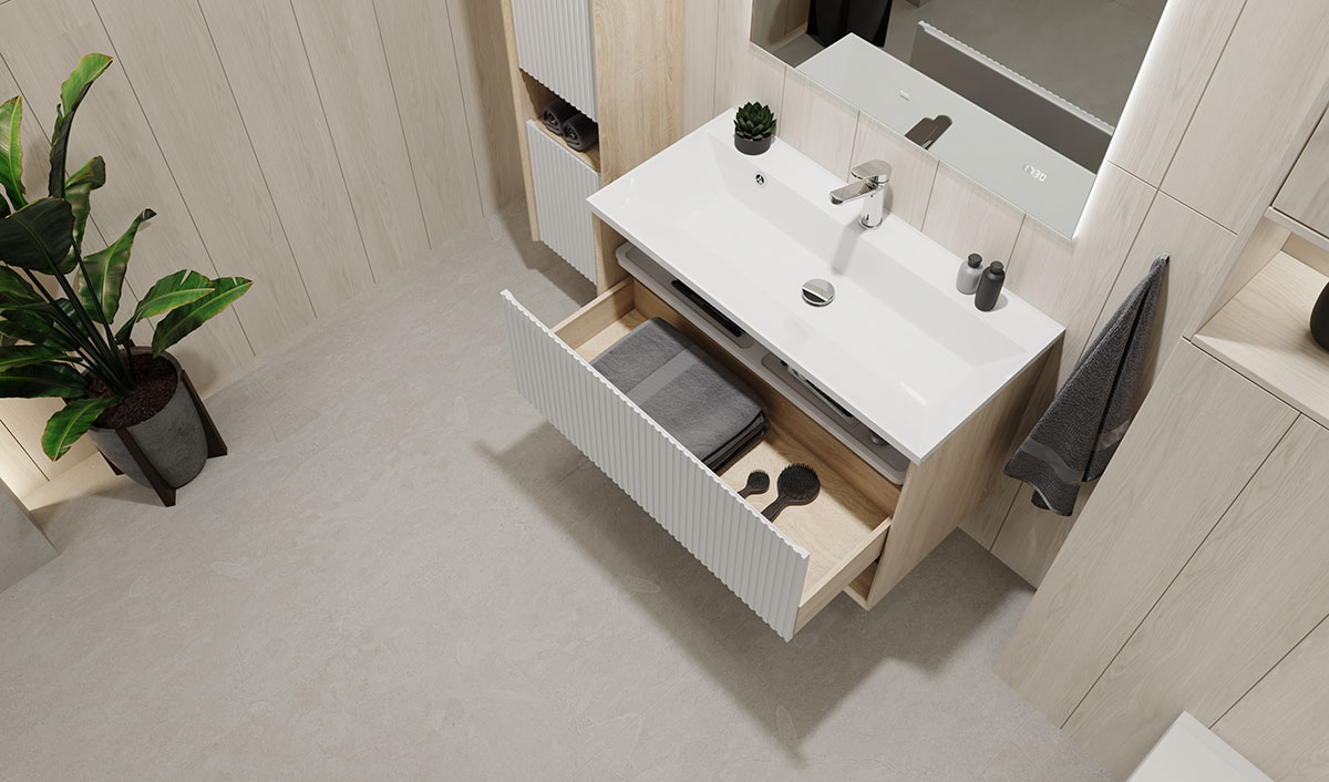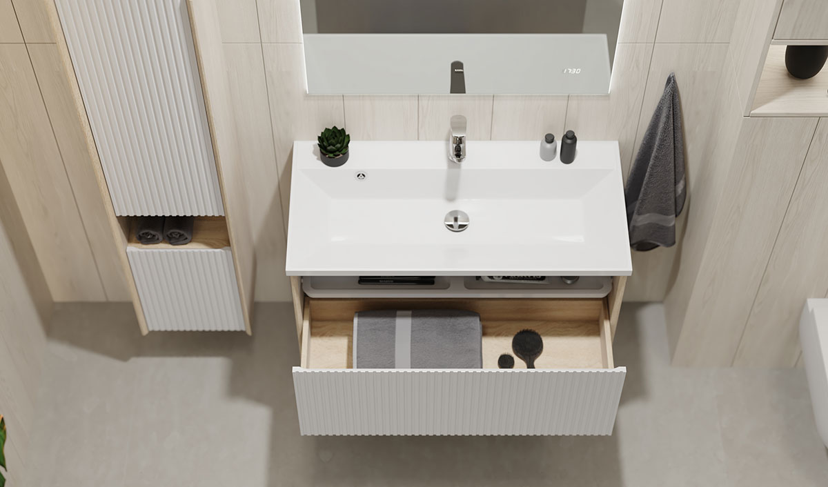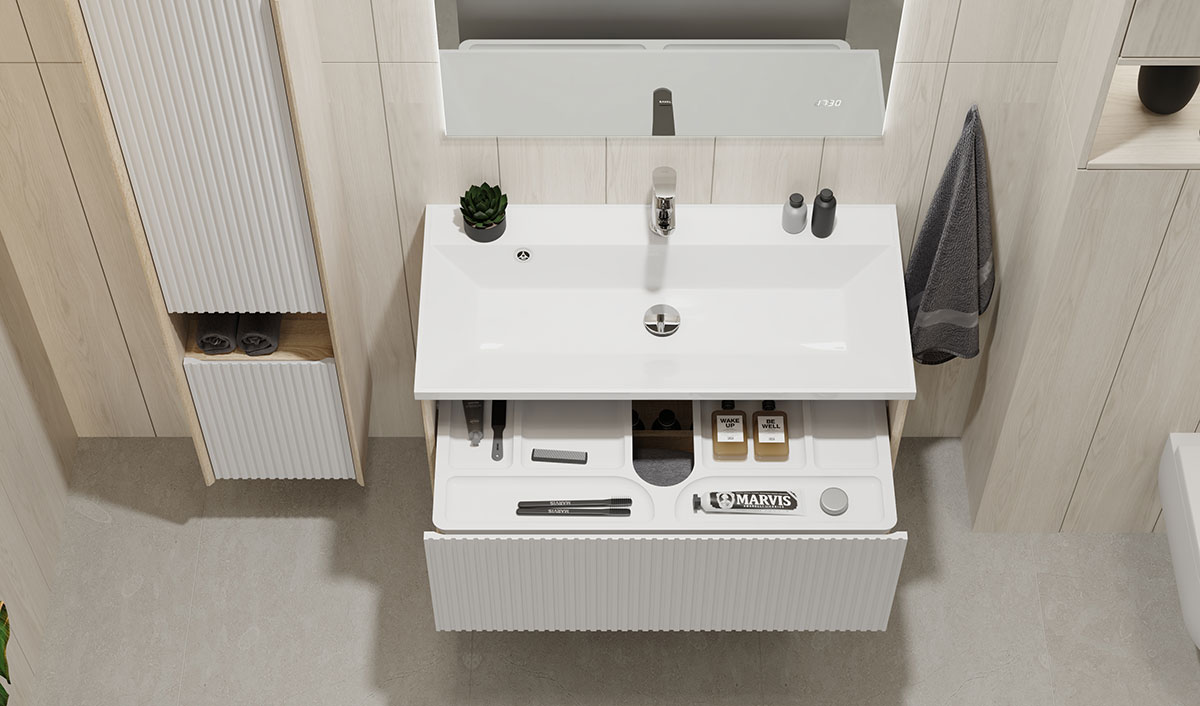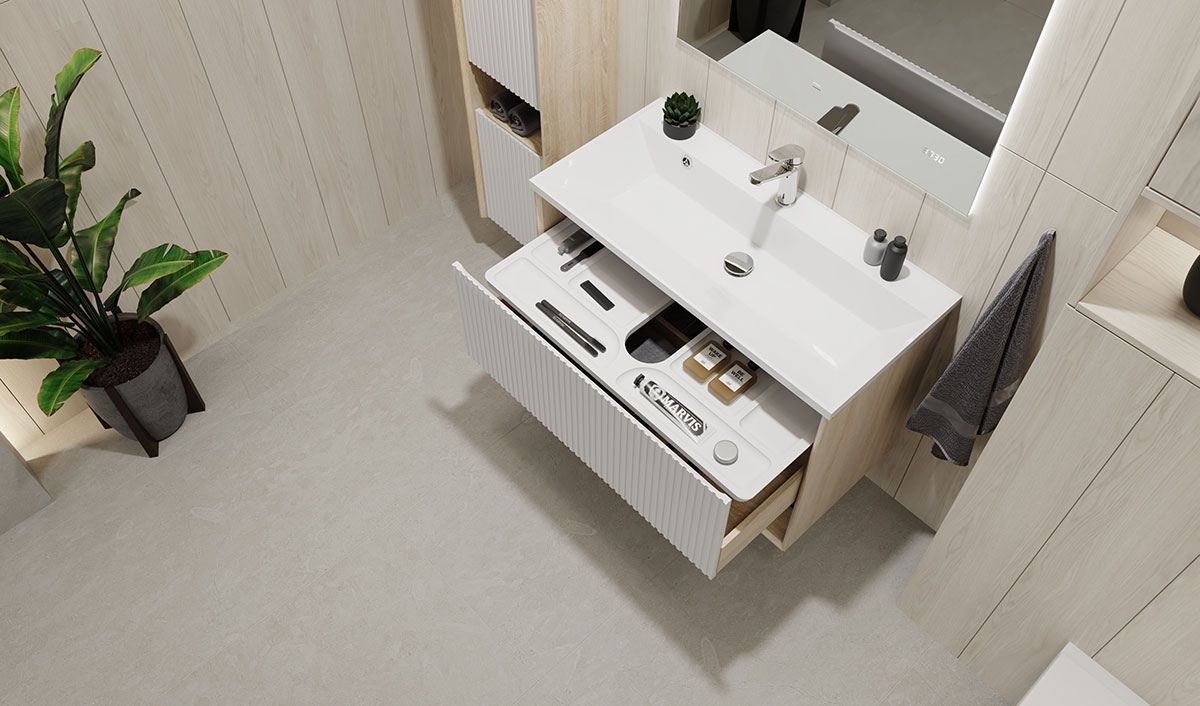 Особенностью тумб данной коллекции является выдвижной органайзер для хранения мелочей.