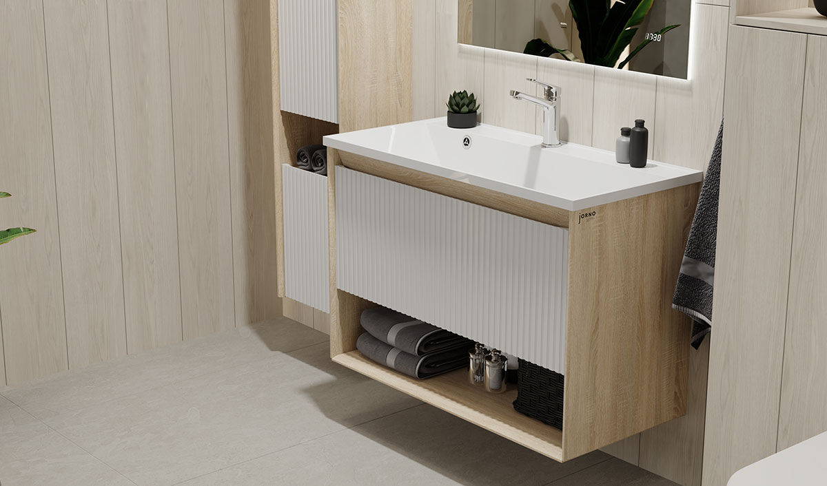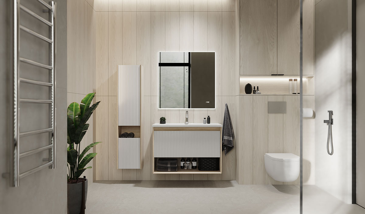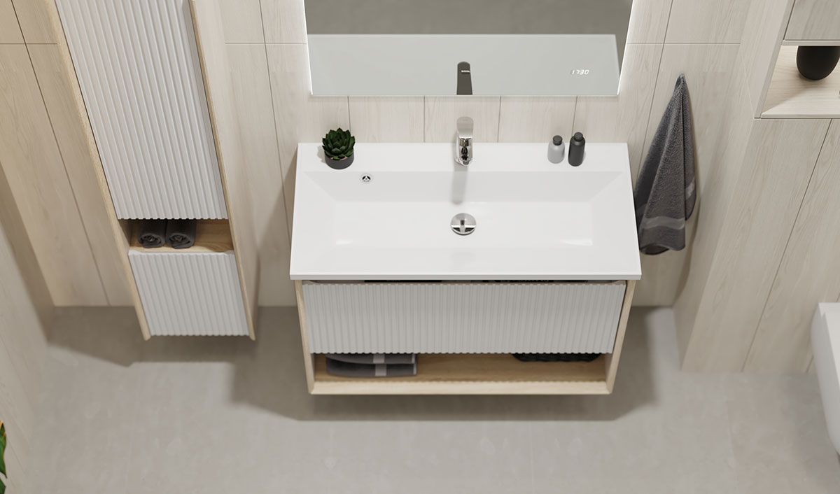 Стильное дизайнерское решение гармонично сочетается с функциональностью, а материалы богатой текстуры – с практичностью. Тумбы выполнены из влагостойких материалов и оснащены раковиной из литьевого мрамора (а белом цвете) или из кварца ( в черном цвете).